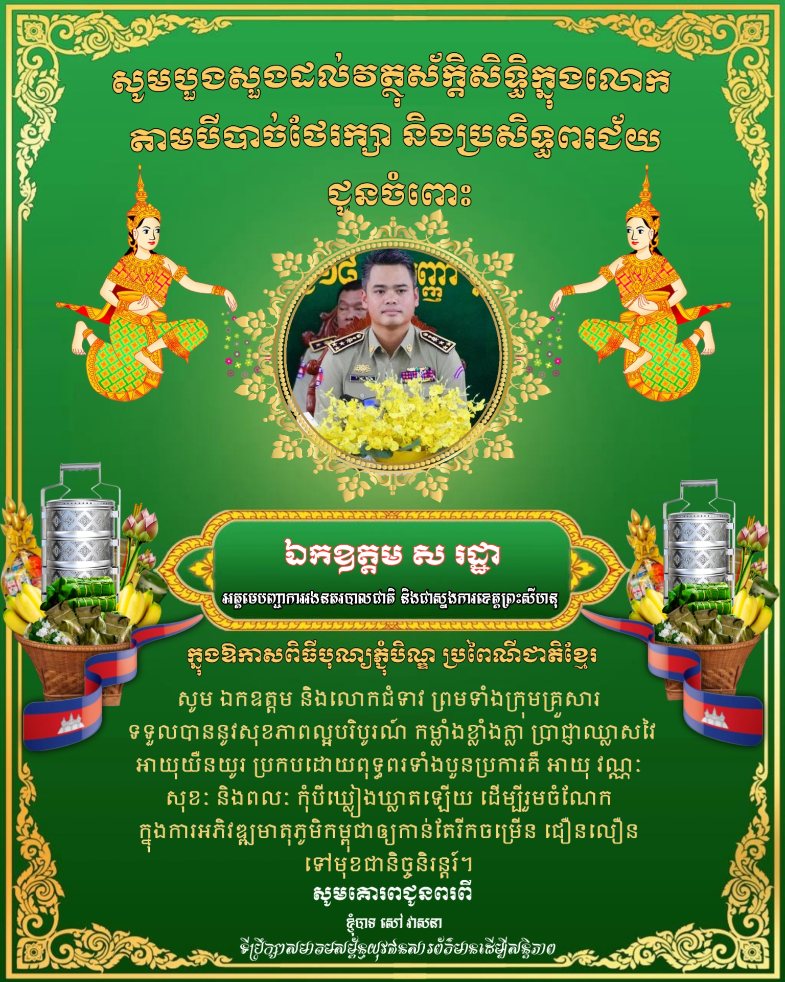 សារលិខិតជូនពរ ឯកឧត្តម ឧត្តមសេនីយ៍ឯក ស រដ្ឋា អគ្គមេបញ្ជាការរងនគរបានជាតិ និងជាស្នងការនគរបាលខេត្តព្រះសីហនុ និងលោកជំទាវ ព្រមទាំងក្រុមគ្រួសារ ជាទីគោរពដ៏ខ្ពង់ខ្ពស់! នាឱកាស នៃពិធីបុណ្យភ្ជុំបិណ្ឌ ប្រពៃណីជាតិខ្មែរ.