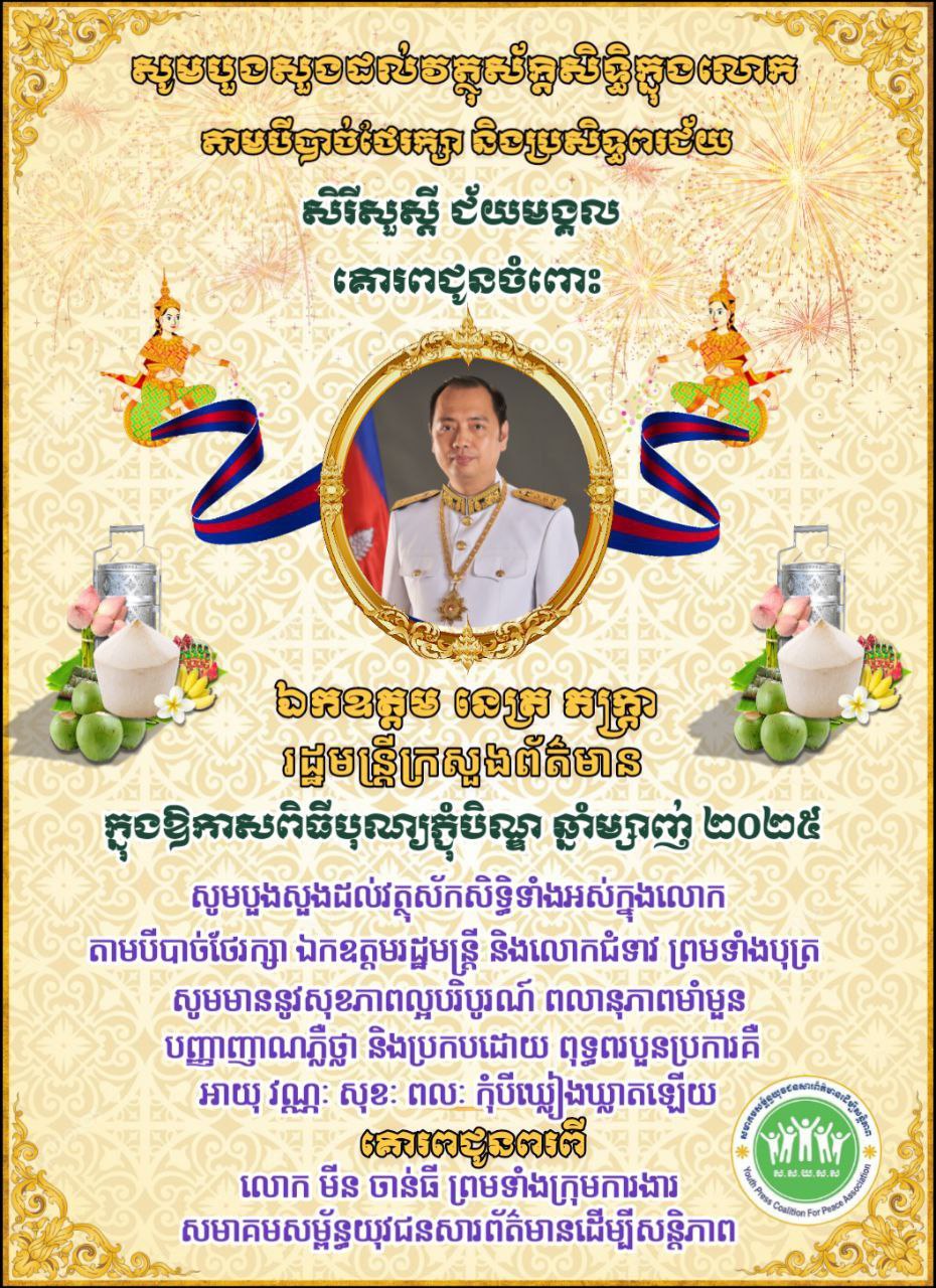 គោរពជូនពរពី ខ្ញុំបាទ មីន ចាន់ធី ព្រមទាំងក្រុមការងារសមាគមសម្ព័ន្ធ យុវជនសារព័ត៌មានដើម្បីសន្តិភាព.