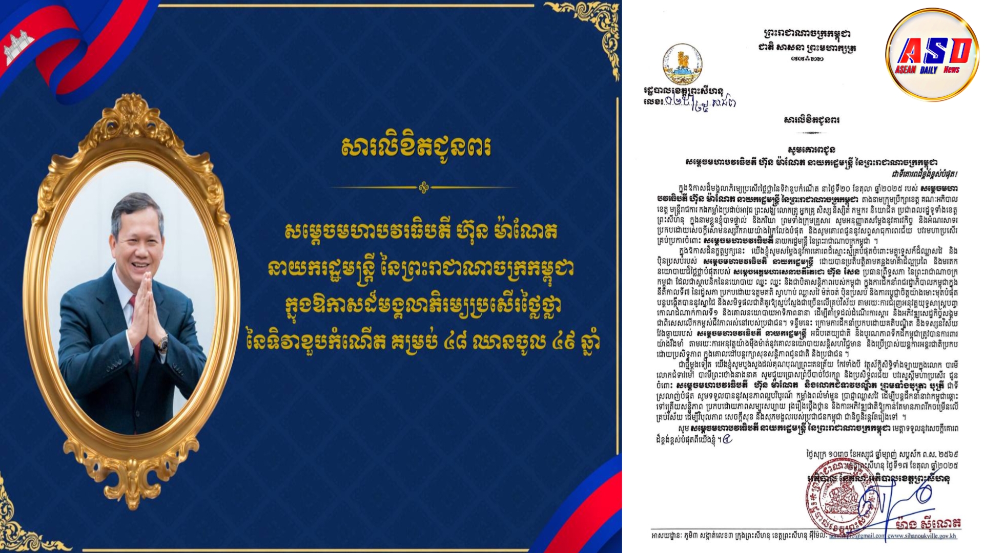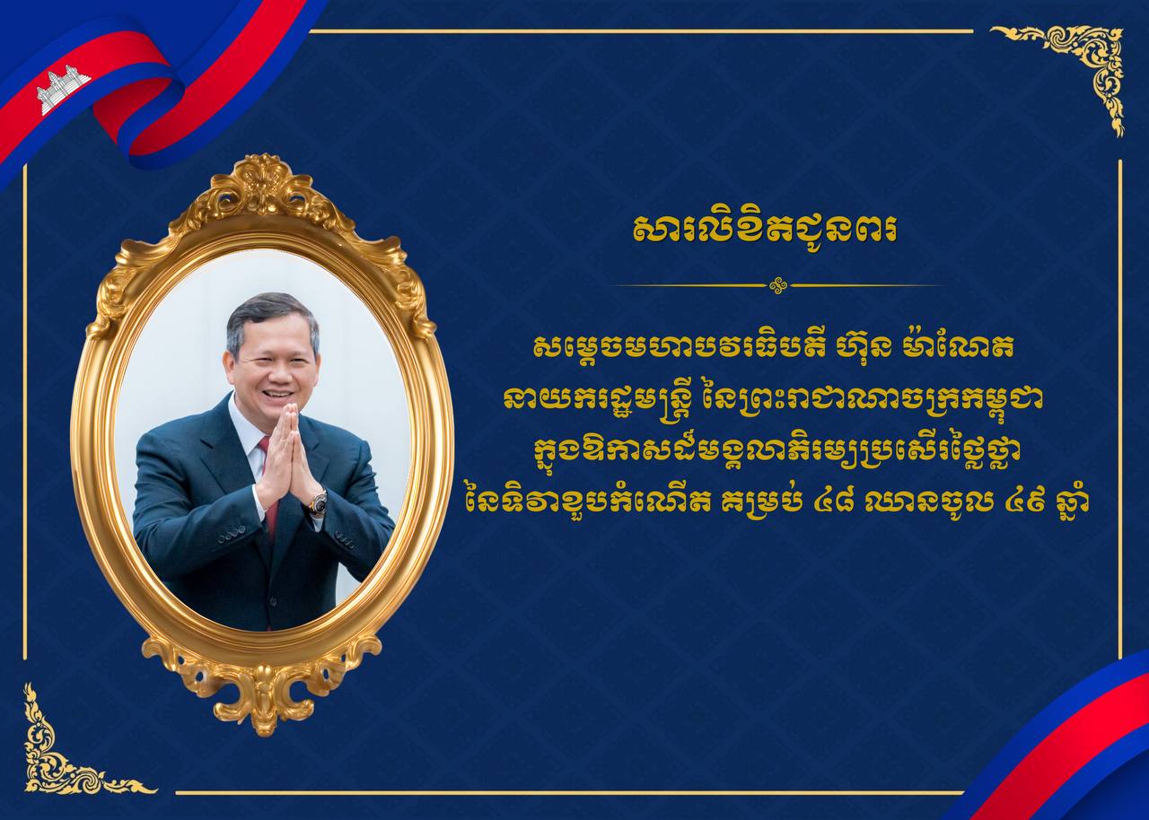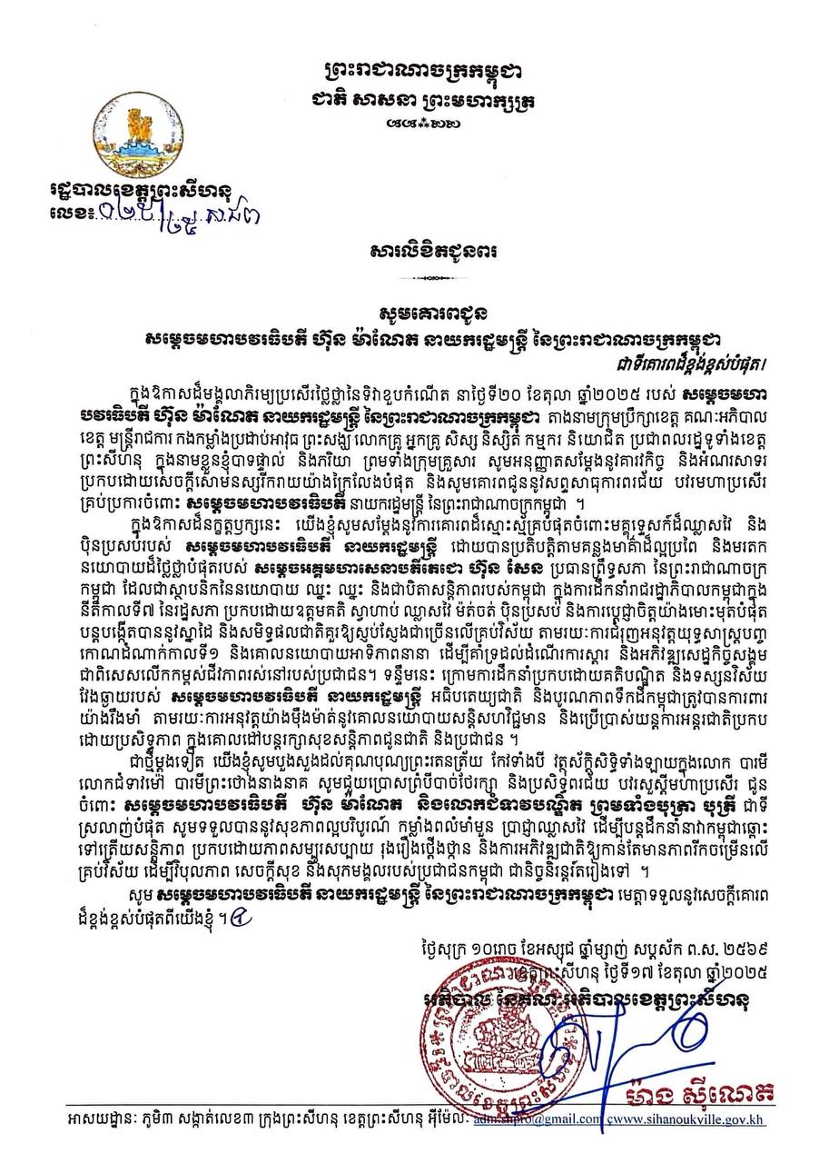 ក្នុងឱកាសដ៏មង្គលាភិរម្យប្រសើរថ្លៃថ្លានៃទិវាខួបកំណើត នាថ្ងៃទី២០ ខែតុលា ឆ្នាំ២០២៥ របស់ សម្តេចមហា បវរធិបតី ហ៊ុន ម៉ាណែត នាយករដ្ឋមន្ត្រី នៃព្រះរាជាណាចក្រកម្ពុជា តាងនាមក្រុមប្រឹក្សាខេត្ត គណៈអភិបាល ខេត្ត មន្ត្រីរាជការ កងកម្លាំងប្រដាប់អាវុធ ព្រះសង្ឃ លោកគ្រូ អ្នកគ្រូ សិស្ស និស្សិត កម្មករ និយោជិត ប្រជាពលរដ្ឋទូទាំងខេត្ត ព្រះសីហនុ ក្នុងនាមខ្លួនខ្ញុំបាទផ្ទាល់ និងភរិយា ព្រមទាំងក្រុមគ្រួសារ សូមអនុញ្ញាតសម្តែងនូវគារវកិច្ច និងអំណរសា ប្រកបដោយសេចក្តីសោមនស្សរីករាយយ៉ាងក្រៃលែងបំផុត និងសូមគោរពជូននូវសព្ទសាធុការពរជ័យ បវរមហាប្រសើរ គ្រប់ប្រការចំពោះ សម្តេចមហាបវរធិបតី នាយករដ្ឋមន្ត្រី នៃព្រះរាជាណាចក្រកម្ពុជា ។