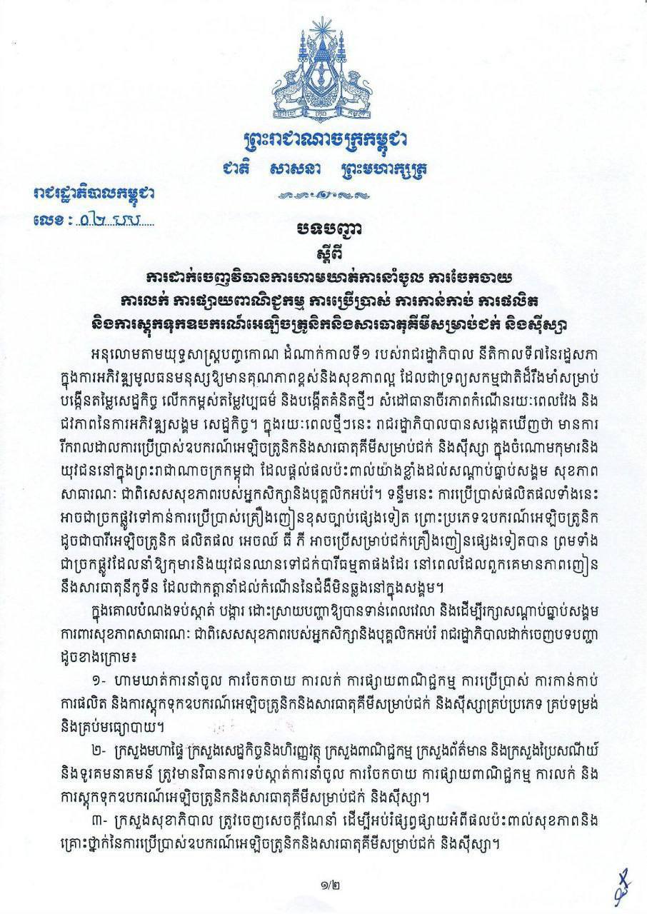 បទបញ្ជារបស់រាជរដ្ឋាភិបាលកម្ពុជា ស្តីពីការដាក់ចេញវិធានការ ហាមឃាត់ការនាំចូល ការចែកចាយ ការលក់ ការផ្សាយ ពាណិជ្ជកម្ម ការប្រើប្រាស់ ការកាន់កាប់ ការផលិត និងការស្តុកទុក ឧបករណ៍អេឡិចត្រូនិក និងសារធាតុគីមី សម្រាប់ជក់ និងស៊ីស្សា!