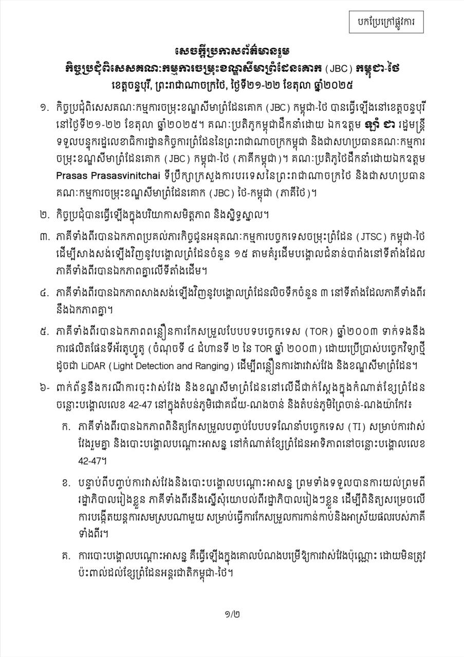 សេចក្តីប្រកាសព័ត៌មានរួម កិច្ចប្រជុំពិសេសគណៈកម្មការចម្រុះខណ្ឌសីមាព្រំដែនគោក (JBC) កម្ពុជា-ថៃ.