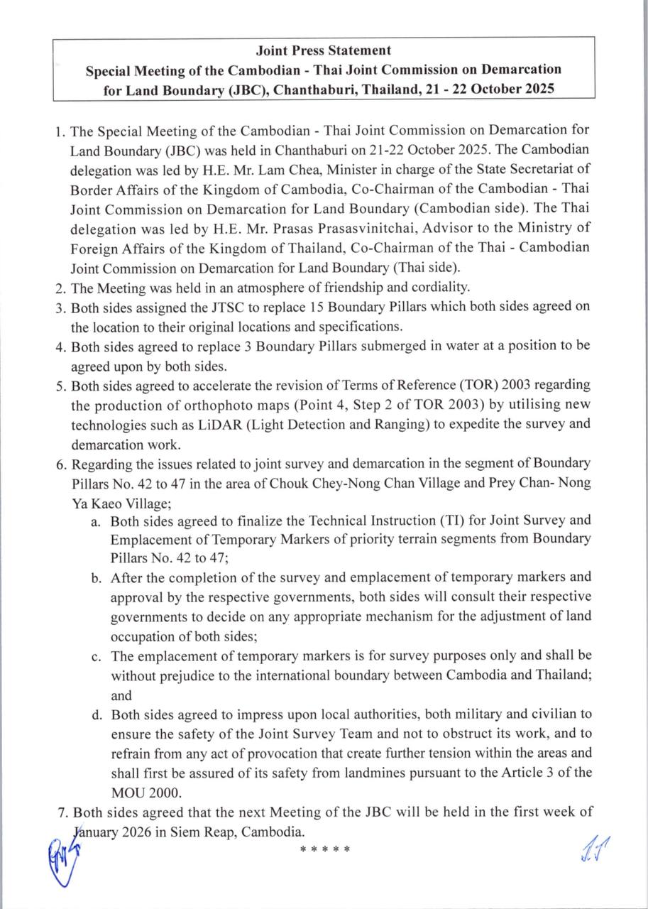 សេចក្តីប្រកាសព័ត៌មានរួម កិច្ចប្រជុំពិសេសគណៈកម្មការចម្រុះខណ្ឌសីមាព្រំដែនគោក (JBC) កម្ពុជា-ថៃ