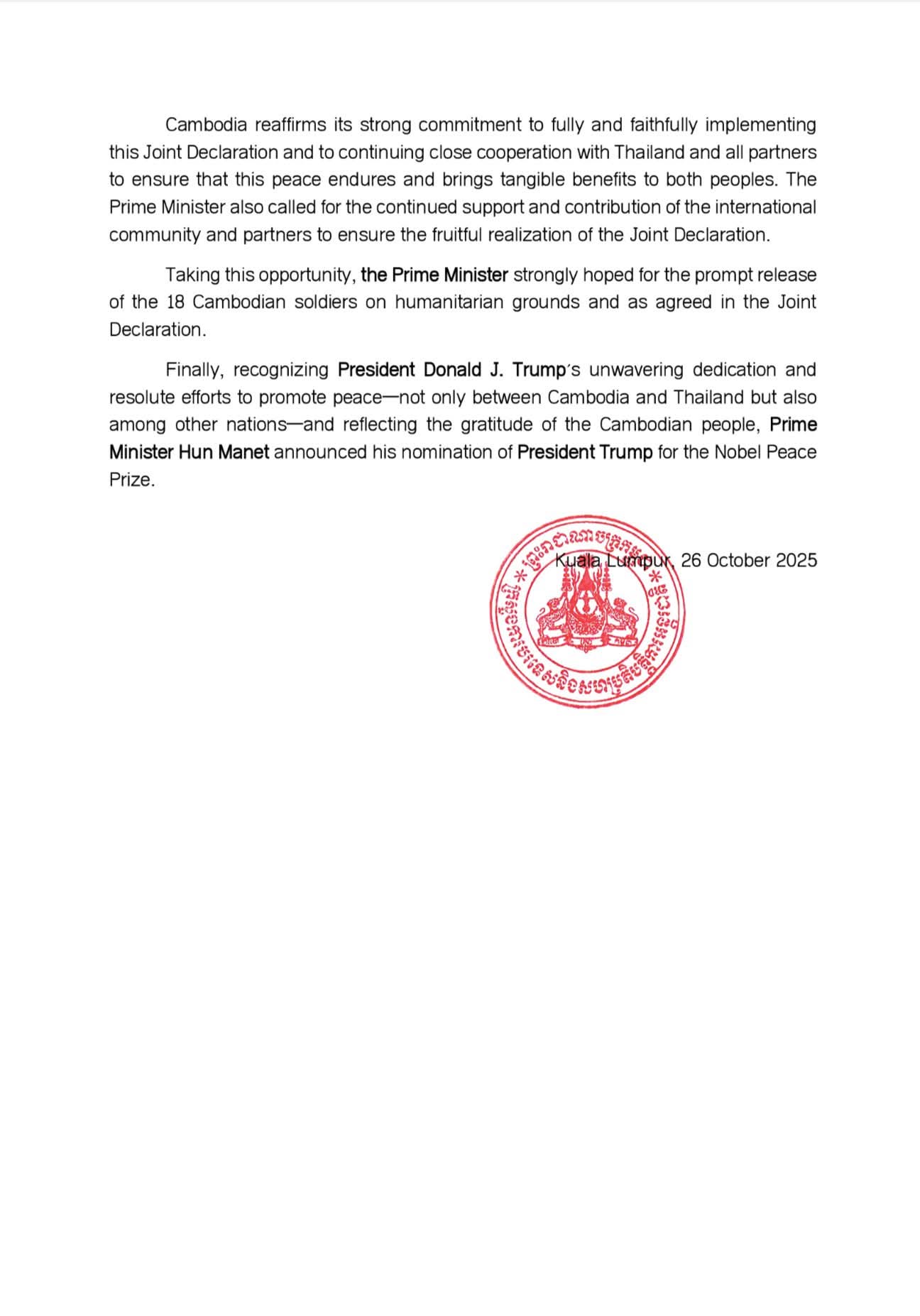 សេចក្តីប្រកាសព័ត៌មានរបស់ ក្រសួងការបរទេស និង សហប្រតិបត្តិការអន្តរជាតិស្តីពី លទ្ធផលនៃពិធីចុះហត្ថលេខា លើសេចក្តីថ្លែងការណ៍រួមដោយនាយករដ្ឋមន្ត្រីនៃ ព្រះរាជាណាចក្រកម្ពុជា និងនាយករដ្ឋមន្ត្រីនៃ ព្រះរាជាណាចក្រថៃ. ព័ត៌មានជាតិ ដោយ អាស៊ាន ដេលី ថ្ងៃទី 26 ខែ ខែតុលា ឆ្នាំ 2025 21 21 ចែករំលែក