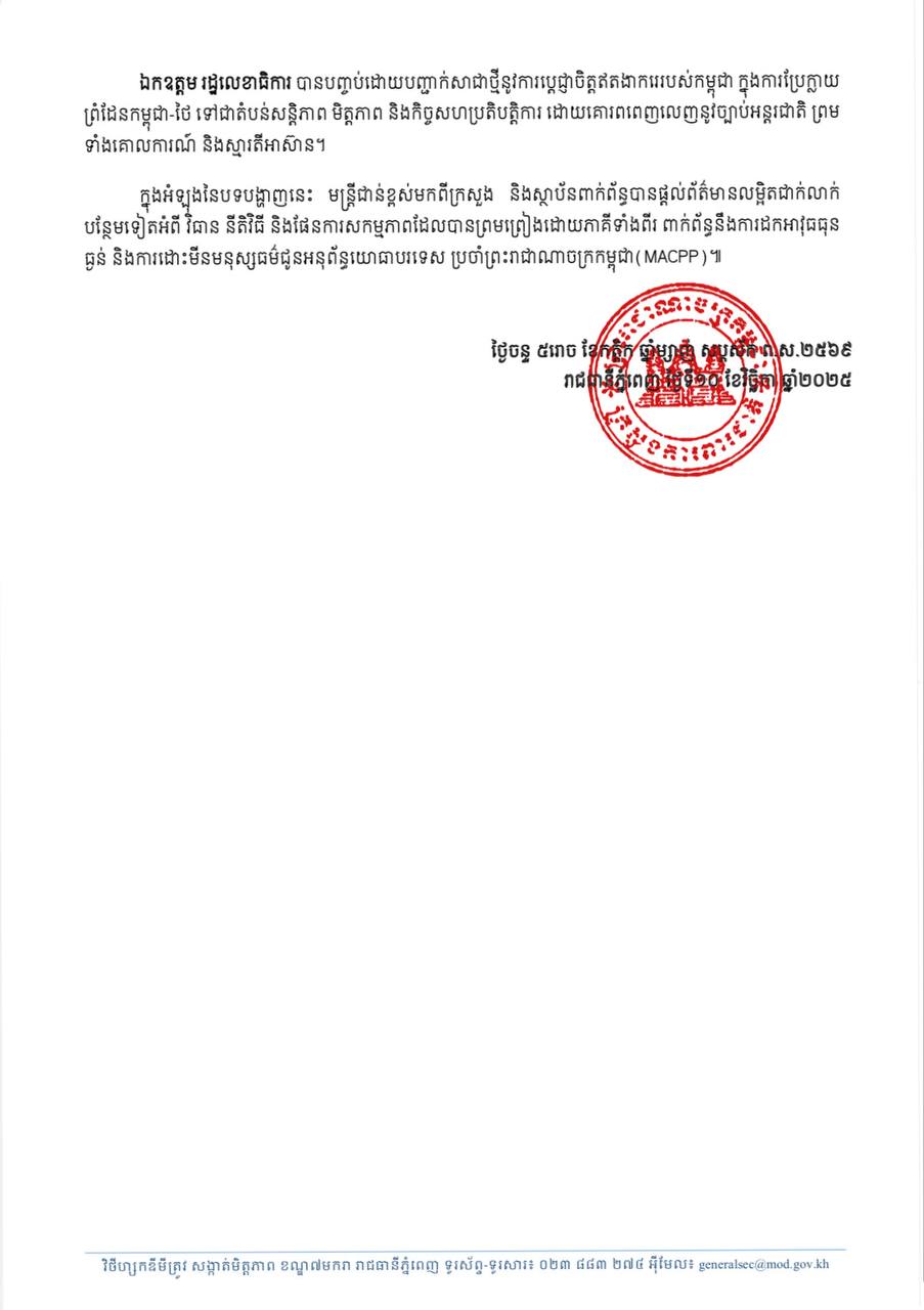 លោកជំទាវ​ ឧត្តម​សេនីយ៍​ឯក​ ម៉ាលី​ សុជាតា អ្នកនាំពាក្យក្រសួងការពារជាតិ នៃ ព្រះរាជាណាចក្រកម្ពុជា សូមជម្រាបជូន សាធារណជន អ្នកសារព័ត៌មានជាតិ និង អន្តរជាតិជ្រាប៖ ឯកឧត្តម ឧត្តមសេនីយ៍ឯក រ៉ាត់ ដារ៉ារ័ត្ន រដ្ឋលេខាធិការក្រសួងការពារជាតិ បានធ្វើបទបង្ហាញជូនអនុព័ន្ធយោធាបរទេស ប្រចាំព្រះរាជាណាចក្រកម្ពុជា (MACPP) អំពី ការអនុវត្តសេចក្តីថ្លែងការណ៍រួមទីក្រុងកូឡាឡាំពួរ.