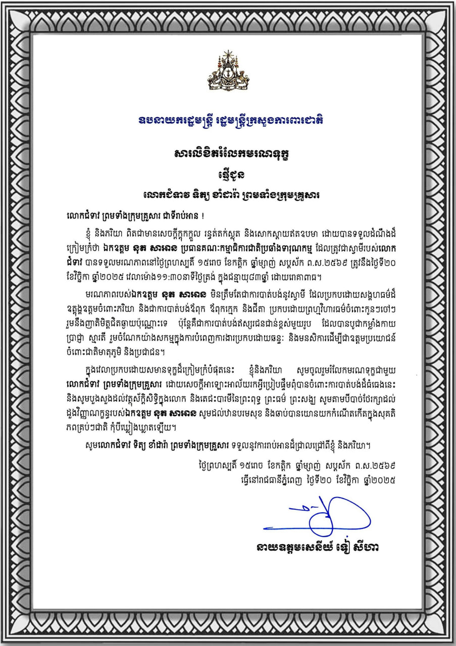 ឧបនាយក​រដ្ឋមន្ត្រី​ រដ្ឋមន្ត្រី​ក្រសួង​ការពារជាតិ​ នា​យ​ឧត្តមសេនីយ៍​ ទៀ​ សីហា|សារលិខិតរំលែកមរណទុក្ខ​ ផ្ញេីជូន​ លោកជំទាវ​ ទិត្យ​ ខាំរ៉ាដា ព្រមទាំង​ក្រុម​គ្រួសារ.