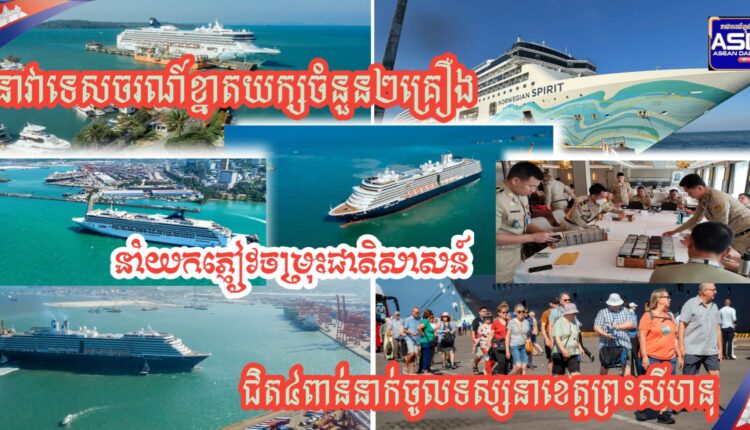 (ខេត្តព្រះសីហនុ)៖ នៅព្រឹកថ្ងៃទី២៧ ខែវិច្ឆិកា ឆ្នាំ២០២៥នាវាទេសចរណ៍ បរទេសចំនួនពីរគ្រឿង បានចូលចតនៅកំពង់ផែស្វយ័តអន្តរជាតិក្រុងព្រះសីហនុ ក្នុងព្រឹកតែមួយដោយសុវត្ថិភាពនឹងបាននាំភ្ញៀវទេសចរណ៍បរទេស ចម្រុះជាតិសាសន៍ជិតបួនពាន់នាក់ចូលទស្សនានៅខេត្តព្រះសីហនុ។