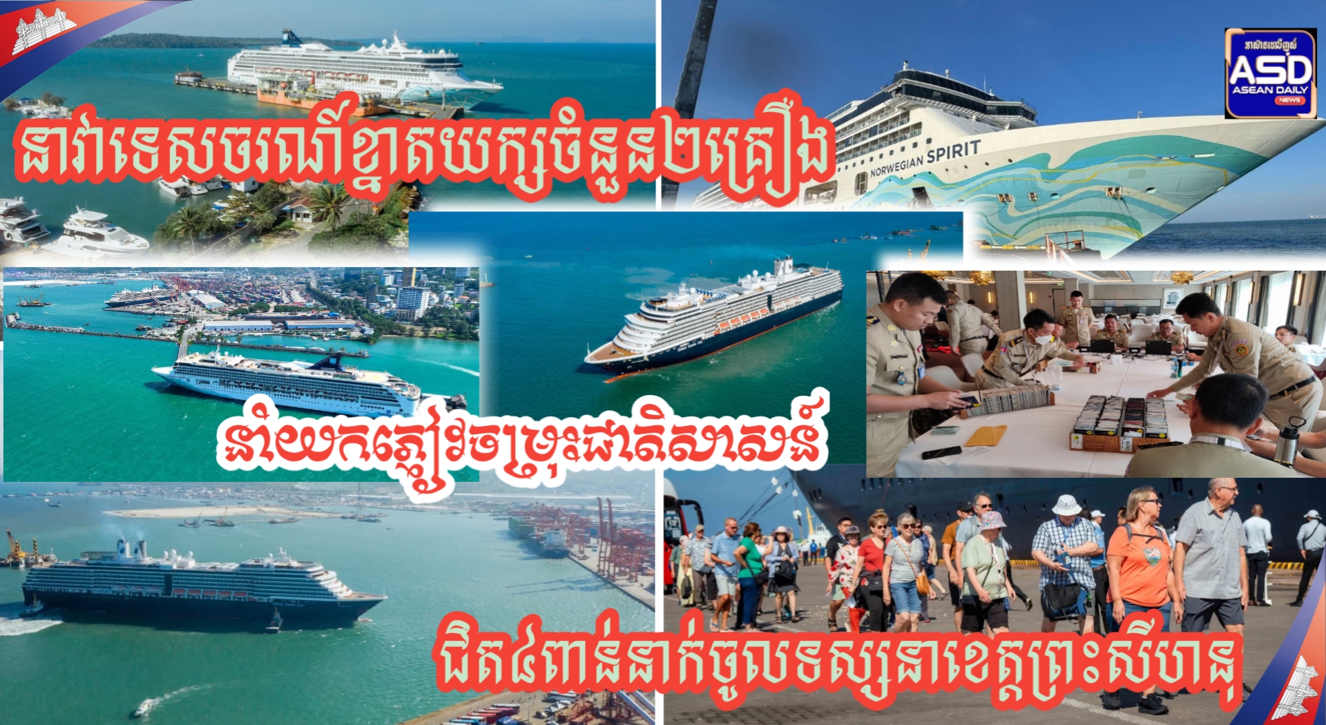 នាវាទាំងនេះ នាវាទី១ NOWEGIAN សញ្ជាតិ BAHAMAS ចូលចតវេលាម៉ោង៨ ព្រឹក ថ្ងៃទី២៧ ខែវិច្ឆិកា ឆ្នាំ២០២៥ នាំភ្ញៀវ ទេសចរណ៍បរទេសចំរុះជាតិសាសន៍ចំនួន ១ ៨៧៧ នាក់ ស្រីចំនួន ១ ០៣៩ នាក់ (មាន៥២ សញ្ជាតិ) រួមនិងនាវឹក ចំនួន៨៦៤ នាក់ ស្រី ១៩១ នាក់ មកទស្សនាប្រទេសកម្ពុជារយៈពេល ០១ថ្ងៃ ។