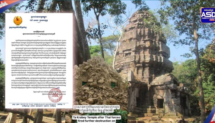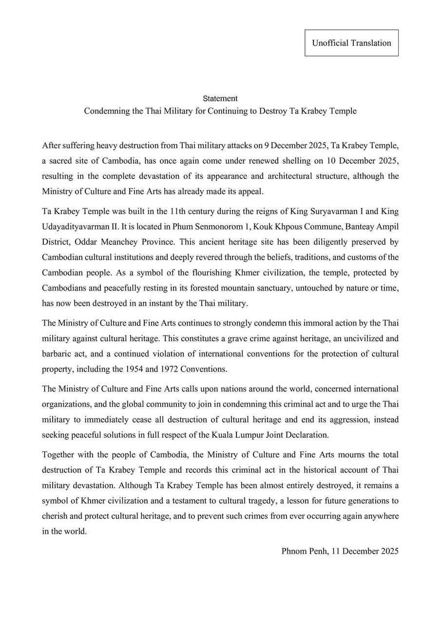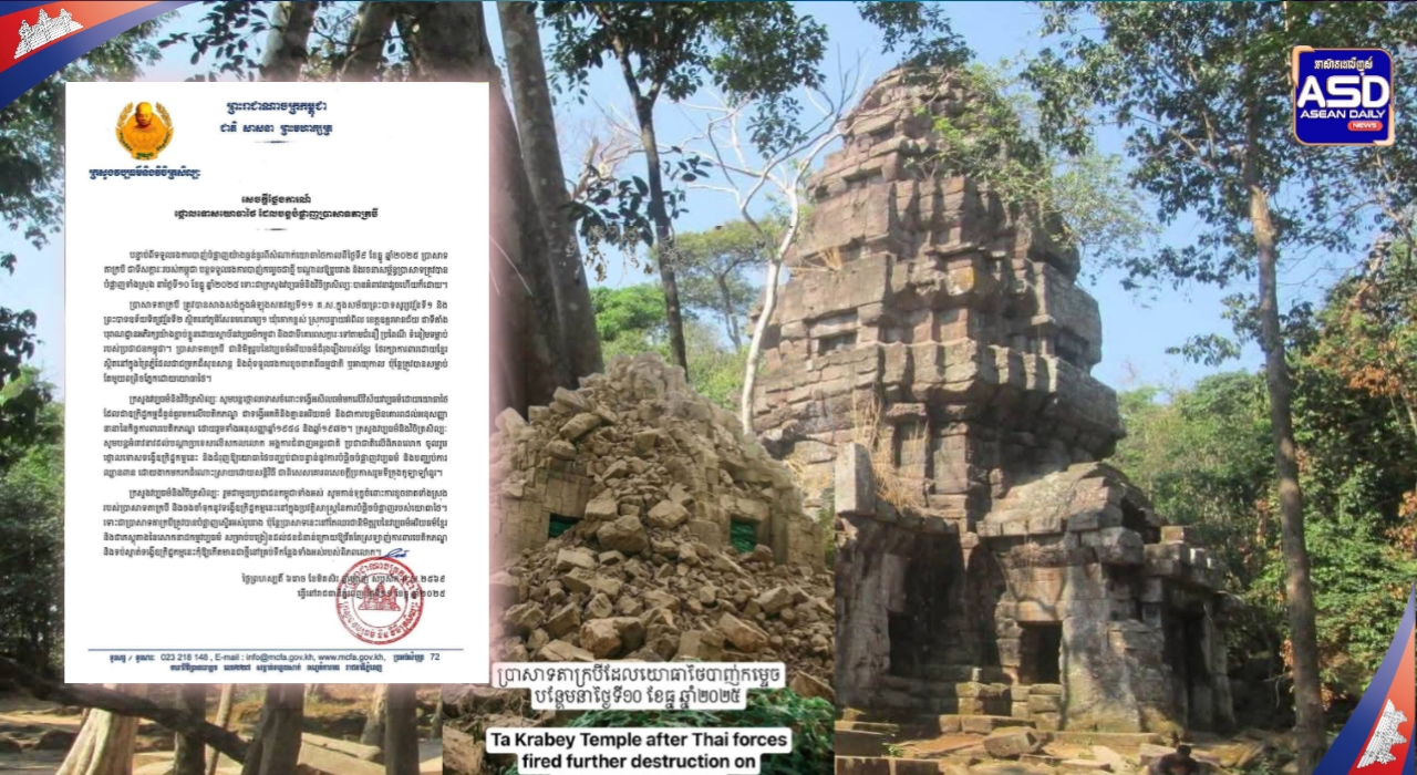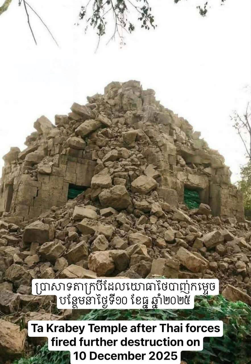 After suffering heavy destruction from Thai military attacks on 8-9 December 2025, Ta Krabey Temple, a sacred site of Cambodia, has once again come under renewed shelling on 10 December 2025, resulting in the complete devastation of its appearance and architectural structure, although the Ministry of Culture and Fine Arts has already made its appeal.