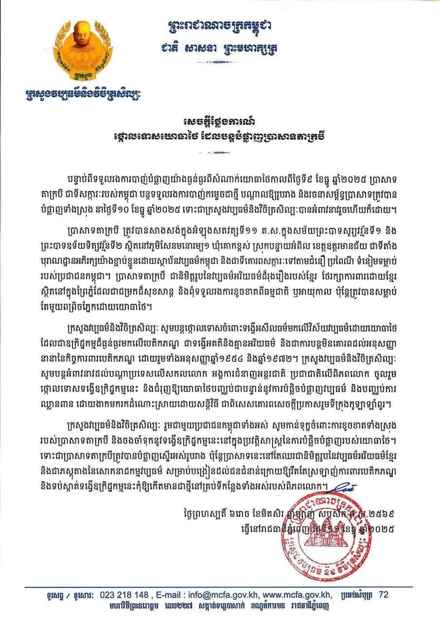 ក្រសួងវប្បធម៌និងវិចិត្រសិល្បៈ|សេចក្តីថ្លែងការណ៍ ថ្កោលទោសយោធាថៃ ដែលបន្តបំផ្លាញប្រាសាទតាក្របី Statement Condemning the Thai Military for Continuing to Destroy Ta Krabey Temple.