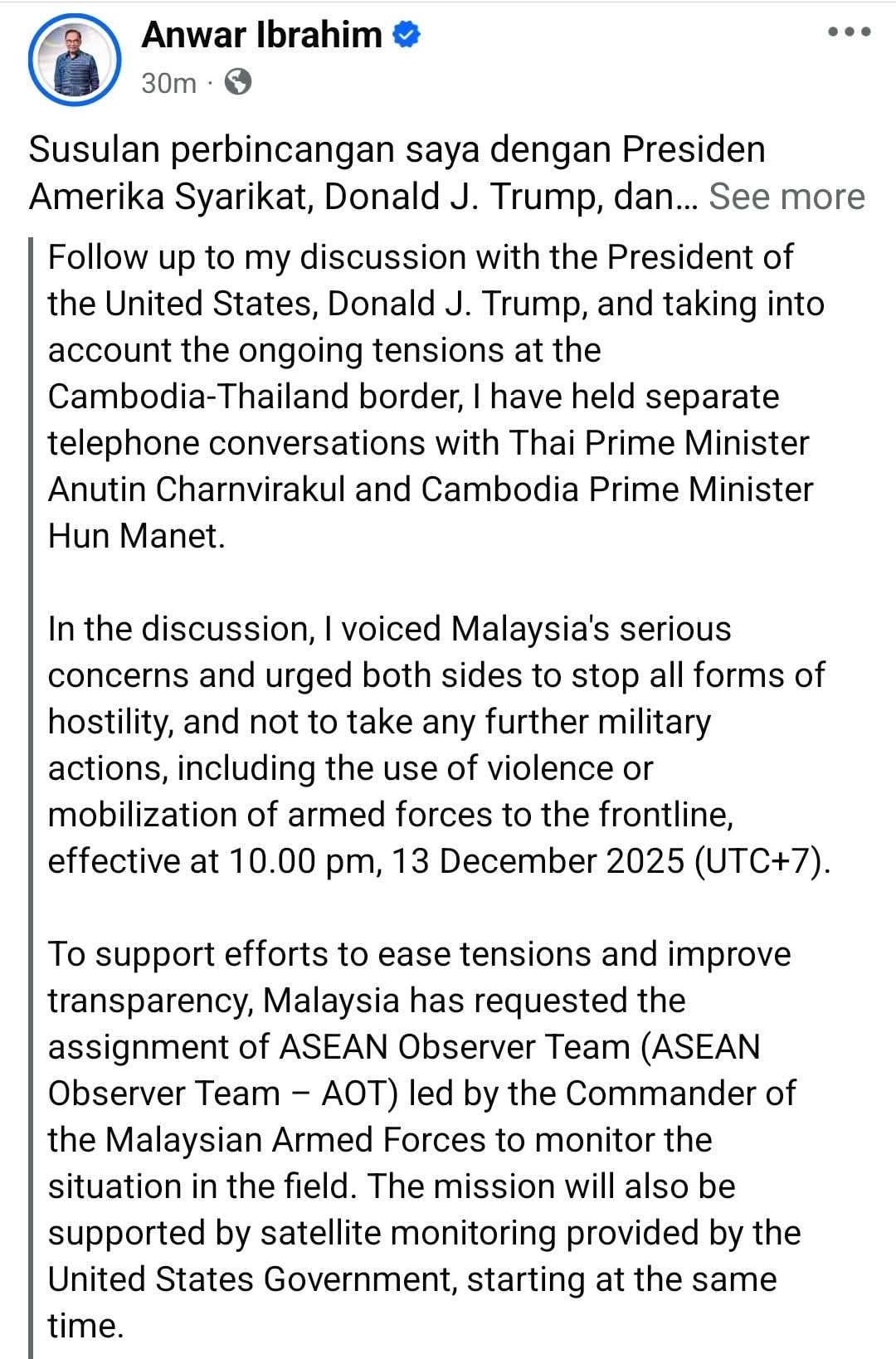 សម្តេច​ធិបតី​ នាយករដ្ឋ​មន្ត្រី​:កម្ពុជាស្វាគមន៍​ និងគាំទ្រគំនិតផ្តួចផ្តើមរបស់ឯ.ឧ Anwar Ibrahim នាយករដ្ឋមន្ត្រីម៉ាឡេស៊ី សម្រាប់ការឈប់បាញ់នាយប់នេះ ដោយមានការតាមដានត្រួតពិនិត្យដោយ ក្រុមត្រួតអ្នកសង្កេតការអាស៊ាន (AOT) និងចូលរួមដោយសហរដ្ឋអាមេរិក។ Cambodia welcomes and supports the initiative of Prime Minister Anwar Ibrahim of Malaysia for a ceasefire tonight, which will be monitored by ASEAN Observation Team (AOT) with participation of the United States.