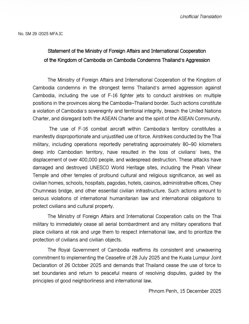 សេចក្តីថ្លែងការណ៍របស់ក្រសួងការបរទេស និងសហប្រតិបត្តិការអន្តរជាតិ នៃ ព្រះរាជាណាចក្រកម្ពុជា ស្តីពី កម្ពុជាថ្កោលទោសការឈ្លានពានរបស់ថៃ Statement of the Ministry of Foreign Affairs and International Cooperation of the Kingdom of Cambodia on Cambodia Condemns Thailand’s Aggression
