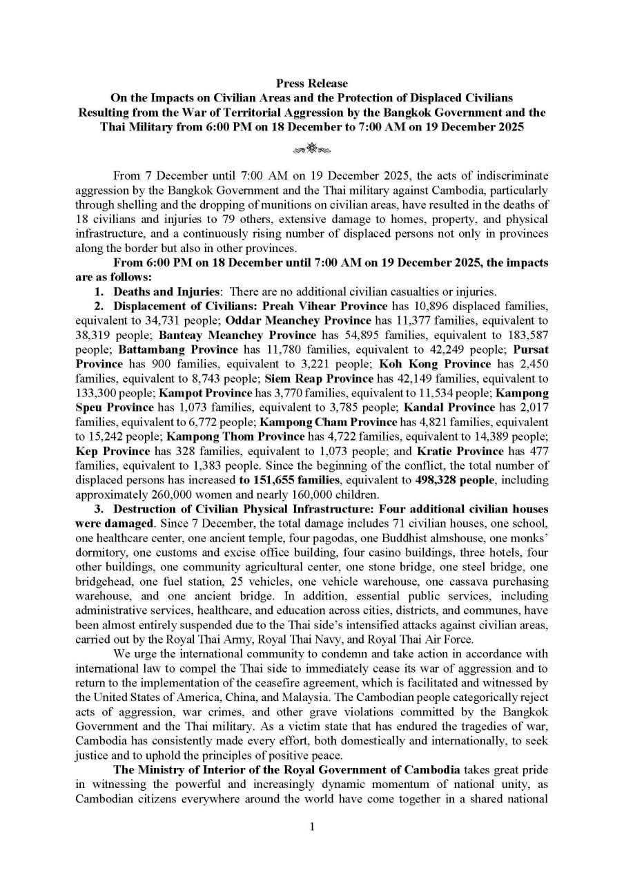 ក្រសួងមហាផ្ទៃ នៃរាជរដ្ឋាភិបាលកម្ពុជា ចេញសេចក្ដីប្រកាសព័ត៌មាន ស្ដីពី ផលប៉ះពាល់លើតំបន់ស៊ីវិល និងការគាំពារពលរដ្ឋភៀសសឹក ដោយសារសង្គ្រាមឈ្លានពានវាតទីទឹកដីរបស់រដ្ឋាភិបាលក្រុងបាងកក និងយោធាថៃចាប់ពីម៉ោង៦ល្ងាច ថ្ងៃទី១៨ ខែធ្នូ រហូតដល់ម៉ោង៧ព្រឹក ថ្ងៃទី១៩ ខែធ្នូ ឆ្នាំ២០២៥។ The Ministry of Interior of the Royal Government of Cambodia Issues a Press Release on the Impacts on Civilian Areas and the Protection of Displaced Civilians Resulting from the War of Territorial Aggression by the Bangkok Government and the Thai Military from 6:00 PM on 18 December to 7:00 AM on 19 December 2025.