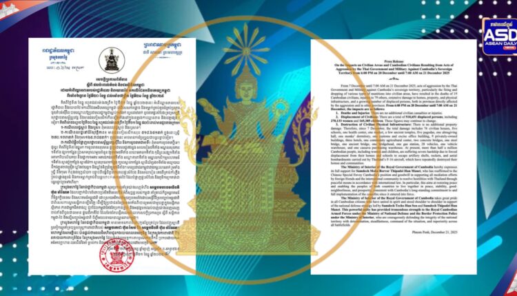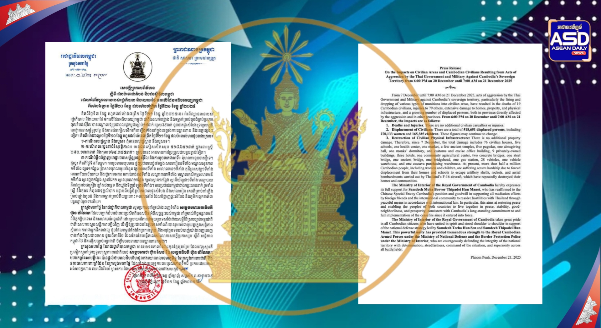 [English Below] ក្រសួងមហាផ្ទៃ នៃរាជរដ្ឋាភិបាលកម្ពុជា ចេញសេចក្ដីប្រកាសព័ត៌មាន ស្ដីពីផលប៉ះពាល់តំបន់ និងជនស៊ីវិលកម្ពុជា ដោយអំពើឈ្លានពានរបស់រដ្ឋាភិបាល និងយោធាថៃ មកលើដែនអធិបតេយ្យកម្ពុជា ពីម៉ោង៦ល្ងាច ថ្ងៃទី២០ ខែធ្នូ ដល់ម៉ោង៧ព្រឹក ថ្ងៃទី២១ ខែធ្នូ ឆ្នាំ២០២៥។ The Ministry of Interior of the Royal Government of Cambodia Issues a Press Release on the Impacts on Civilian Areas and Cambodian Civilians Resulting from Acts of Aggression by the Thai Government and Military Against Cambodia’s Sovereign Territory from 6:00 PM on 20 December until 7:00 AM on 21 December 2025.