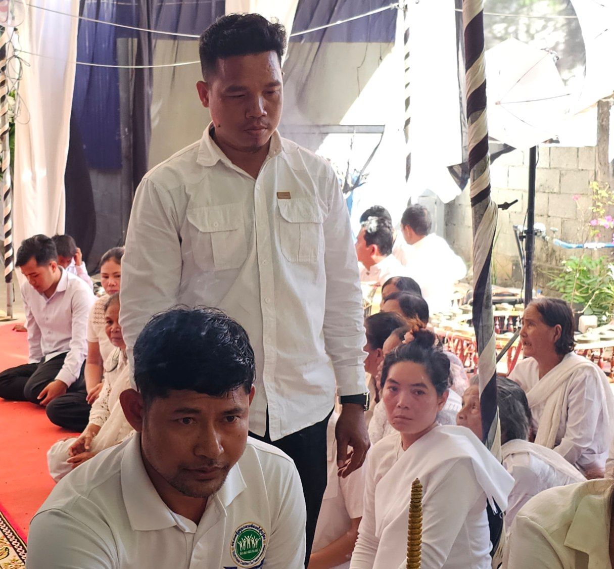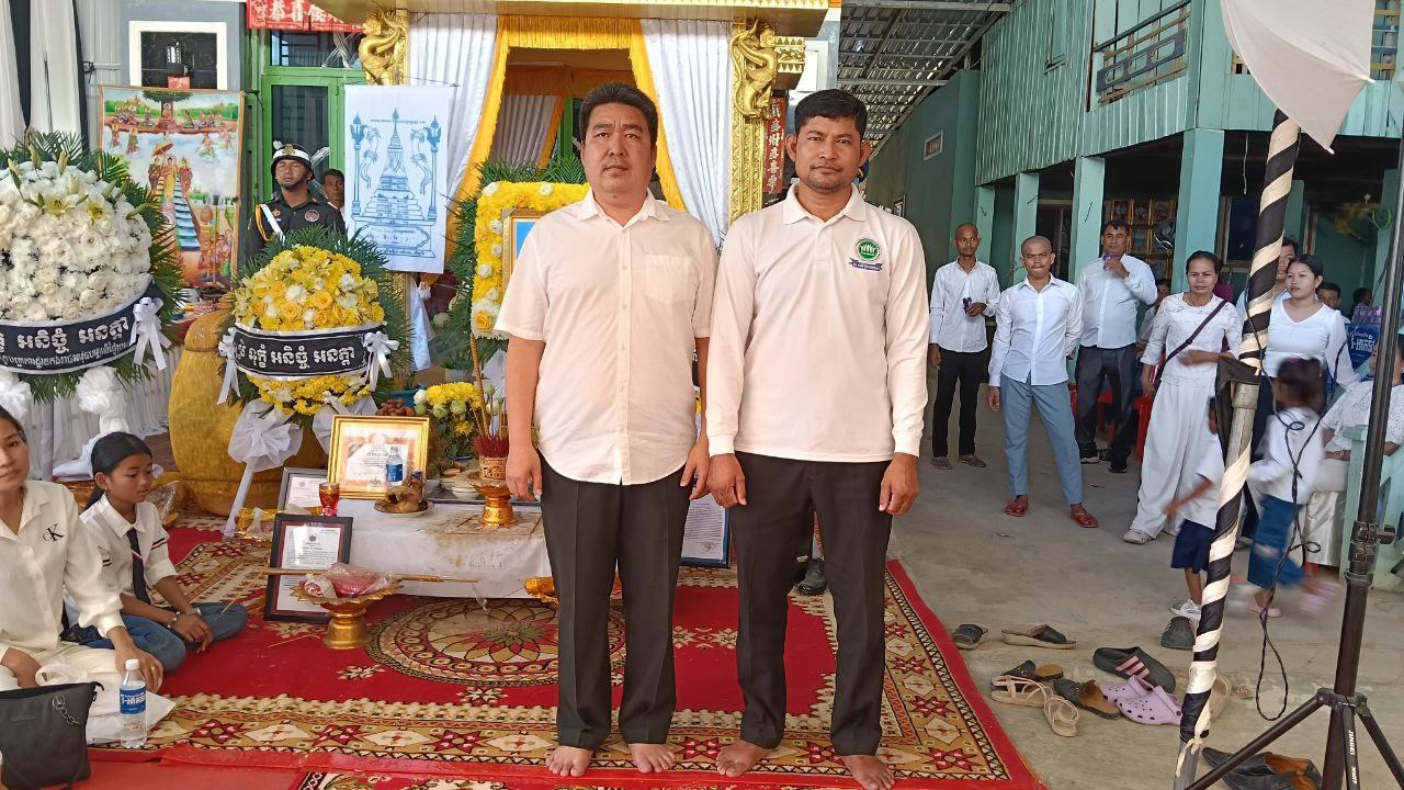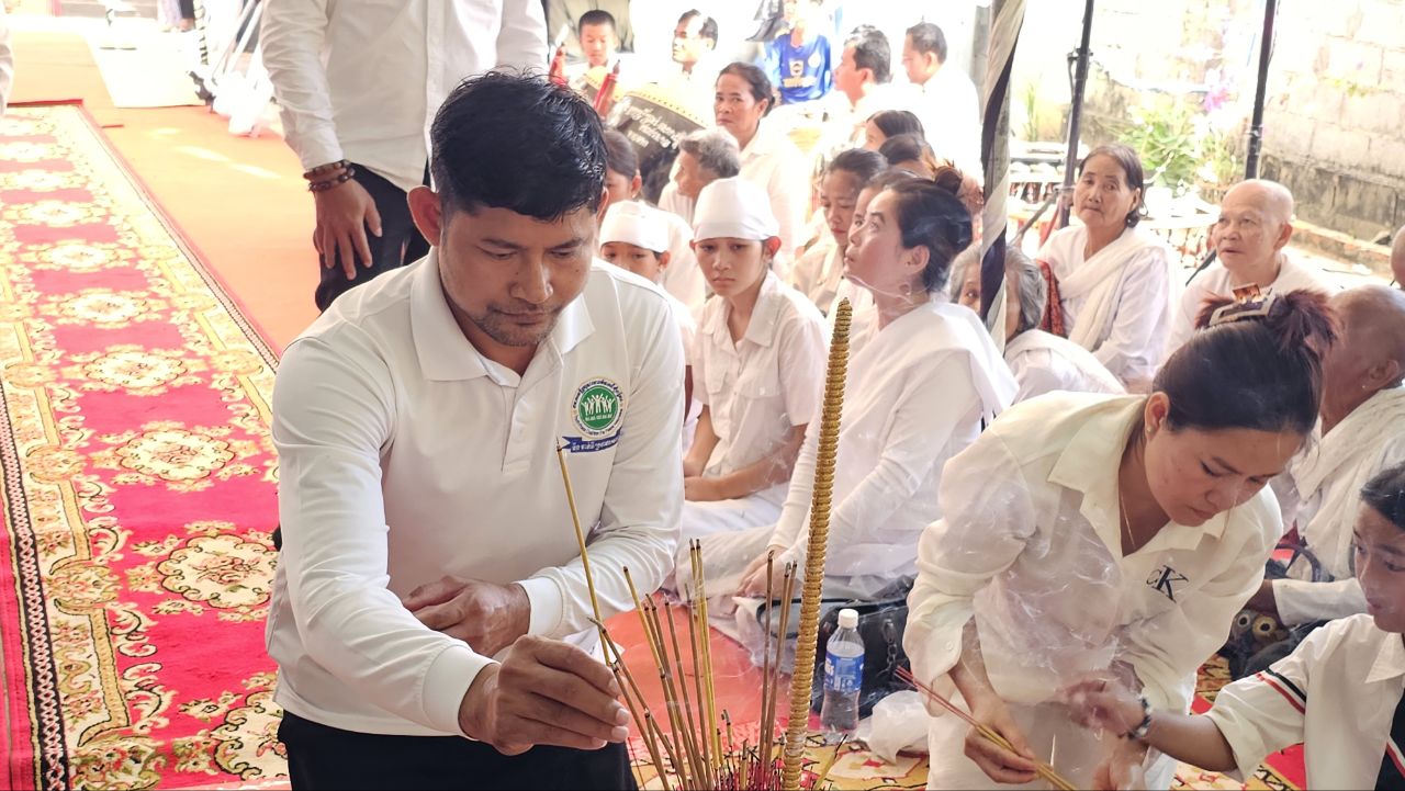 On that occasion, Mr. Min Chanthy Mean brought gifts from generous donors: 3 bags of rice, 20 cups of pure water, 9 boxes of Cambodian pure water, and noodles, fish sauce, soy sauce, chili sauce, including funds from His Excellency Dr. Sok Prasit and generous donors through Mr. Chhun Soviet, Deputy Editor-in-Chief at the New Thai Unit, totaling 350,000 riels.