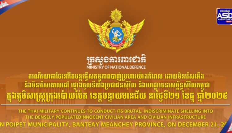 The Thai military continues to conduct its brutal, indiscriminate shelling into the densely populated innocent civilian area and civilian infrastructure in Poipet Municipality, Banteay Meanchey province, on December 21, 2025:
