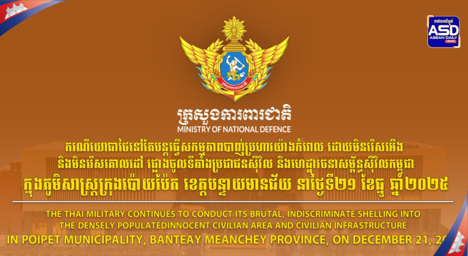 ក្រសួងការពារជាតិ|សង្ខេបស្ថានការណ៍នៅតាមបន្ទាត់ព្រំដែនកម្ពុជា-ថៃ អំពីករណីយោធាថៃនៅតែបន្តការបាញ់ប្រហារ ដើម្បីឈ្លានពានមកលើដែនអធិបតេយ្យរបស់កម្ពុជានៅទិសយោធភូមិភាគទី៤ និងយោធភូមិភាគទី៥