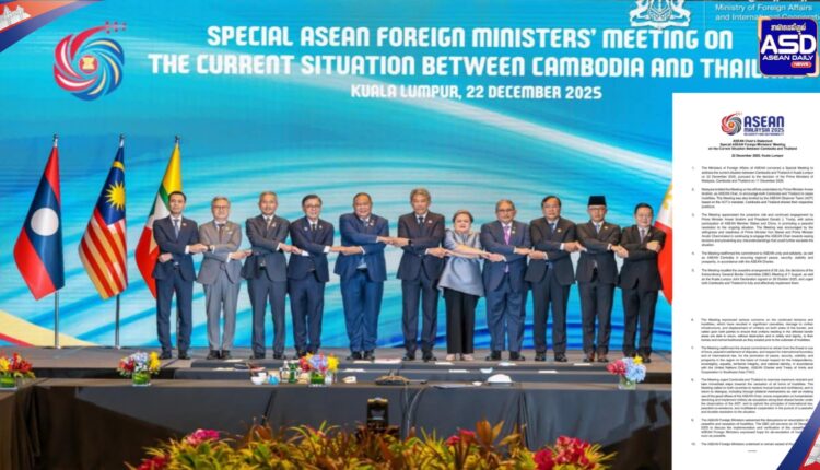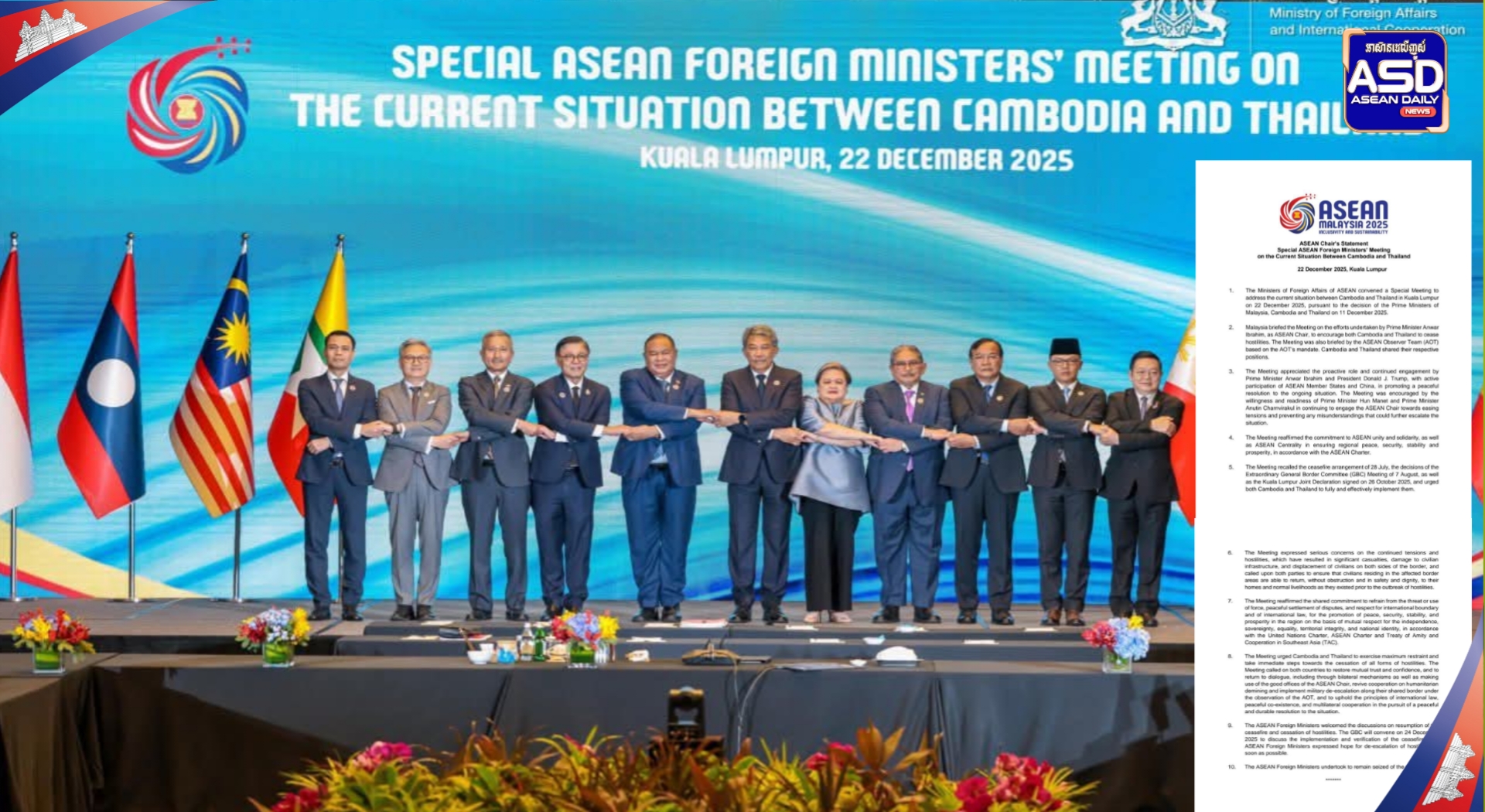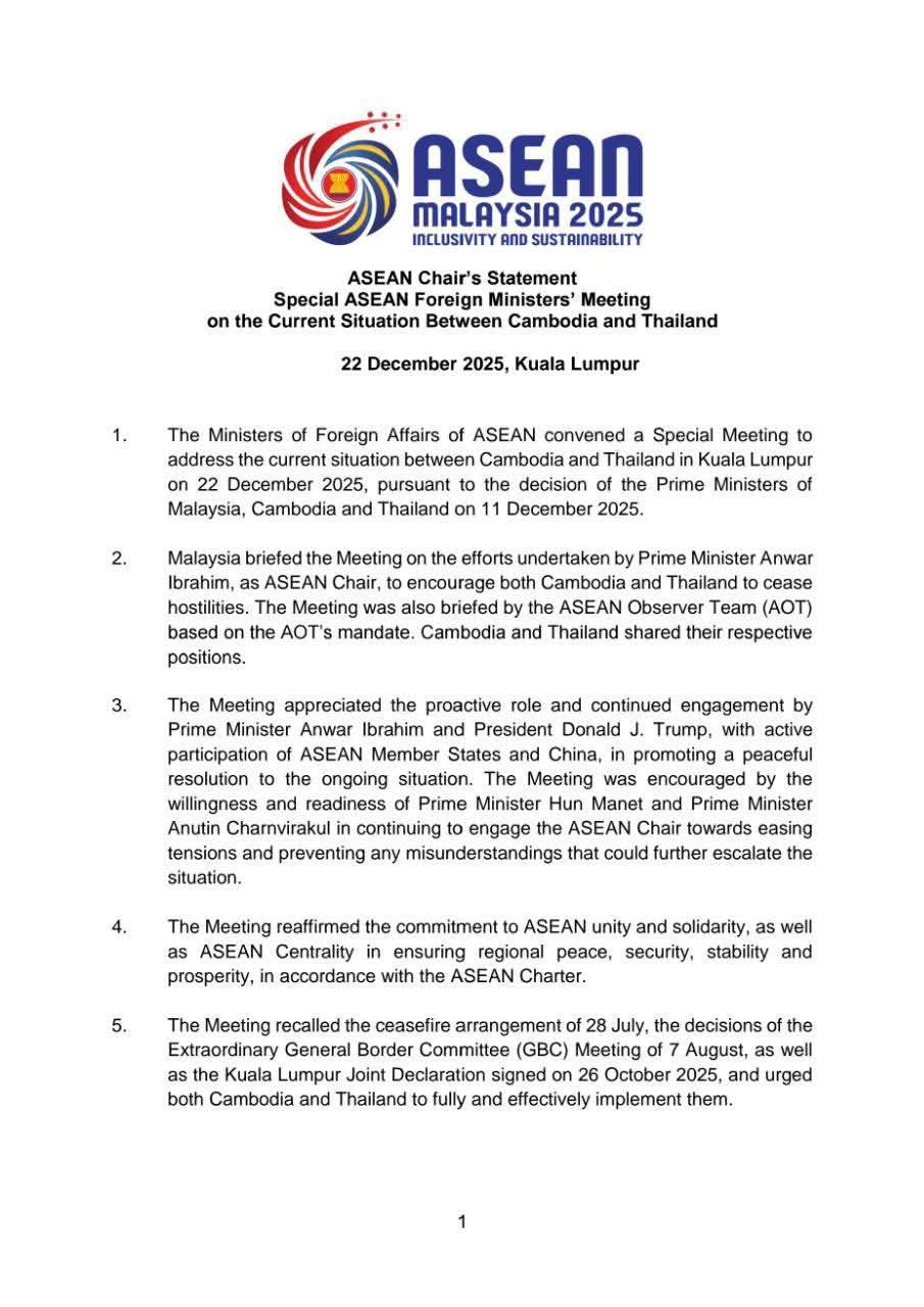 សេចក្តីថ្លែងការណ៍ស្តីពីលទ្ធផលនៃកិច្ចប្រជុំពិសេសរដ្ឋមន្ត្រីការបរទេសអាស៊ាន អំពីស្ថានភាពបច្ចុប្បន្នកម្ពុជា-ថៃ ASEAN Chair’s Statement Special ASEAN Foreign Ministers’ Meeting on the Current Situation Between Cambodia and Thailand.