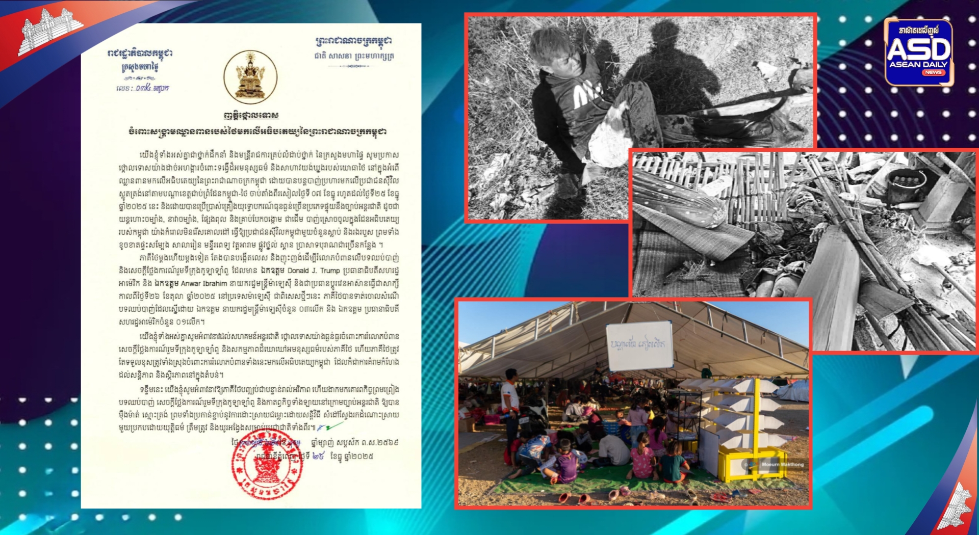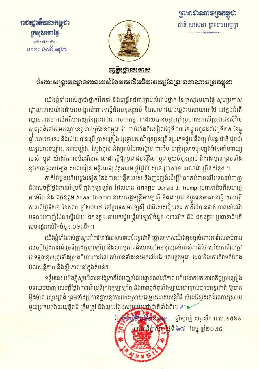 ញត្តិថ្កោលទោសរបស់ក្រសួងមហាផ្ទៃ ចំពោះសង្គ្រាមឈ្លានពានរបស់ថៃ មកលើអធិបតេយ្យភាពនៃព្រះរាជាណាចក្រកម្ពុជា! ព័ត៌មានជាតិ ដោយ អាស៊ាន ដេលី ថ្ងៃទី 25 ខែ ខែធ្នូ ឆ្នាំ 2025 9 ផ្សាយ:ថ្ងៃទី២៥ ខែធ្នូ ឆ្នាំ២០២៥ ដោយ:សៅ វាសនា(HarryVS) 9 ចែករំលែក
