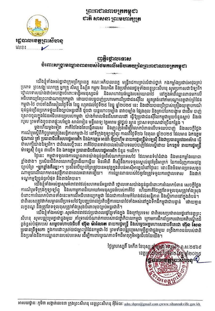 រដ្ឋបាលខេត្តព្រះសីហនុចេញញត្តិថ្កោលទោសយ៉ាងដាច់អហង្ការចំពោះការវាយប្រហារយ៉ាង ព្រៃផ្សៃរបស់ថៃមកលើដែនអធិបតេយ្យកម្ពុជា.