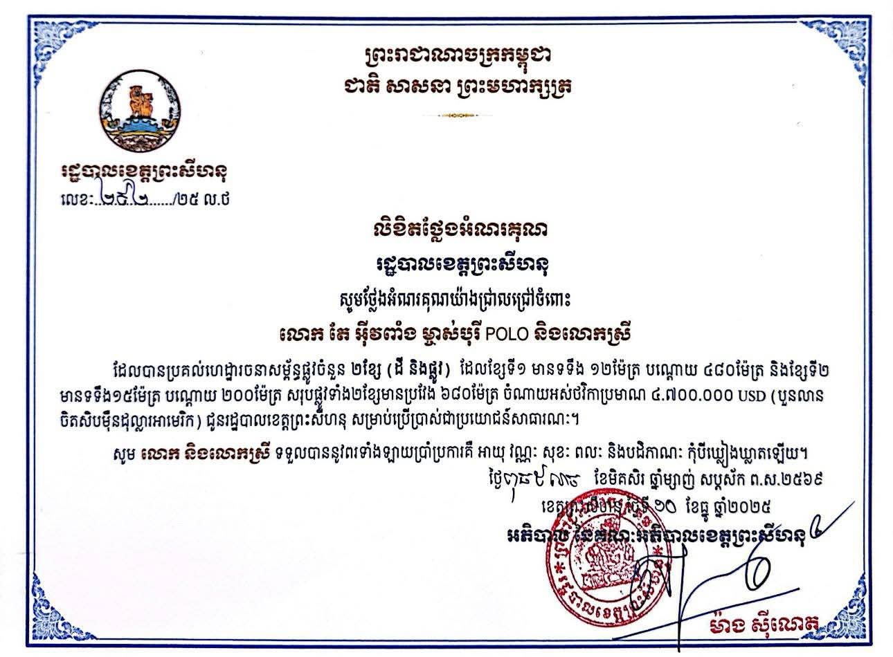 ជាមួយគ្នានោះដែរតាំងនាមរដ្ឋបាលខេត្តព្រះសីហនុ ឯកឧត្តមអភិបាលខេត្ត ក៏បានថ្លែងអំណរគុណយ៉ាងជ្រាលជ្រៅចំពោះ លោក តែ អ៊ីវពាំង ម្ចាស់បុរី POLO និងលោកស្រី ដែលបានប្រគល់ហេដ្ឋារចនាសម្ព័ន្ធផ្លូវចំនួន ២ខ្សែ (ដី និងផ្លូវ) ដែលខ្សែទី១ មានទទឹង ១២ម៉ែត្រ បណ្តោយ ៤៨០ម៉ែត្រ និងខ្សែទី២ មានទទឹង ១៥ម៉ែត្រ បណ្តោយ ២០០ម៉ែត្រ សរុបផ្លូវទាំង២ខ្សែមានប្រវែង ៦៨០ម៉ែត្រ ស្ថិតនៅភូមិ៥ សង្កាត់លេខ៤ ក្រុងព្រះសីហនុ ជូនរដ្ឋបាលខេត្តព្រះសីហនុ សម្រាប់ប្រើប្រាស់ជាប្រយោជន៍សាធារណៈ។