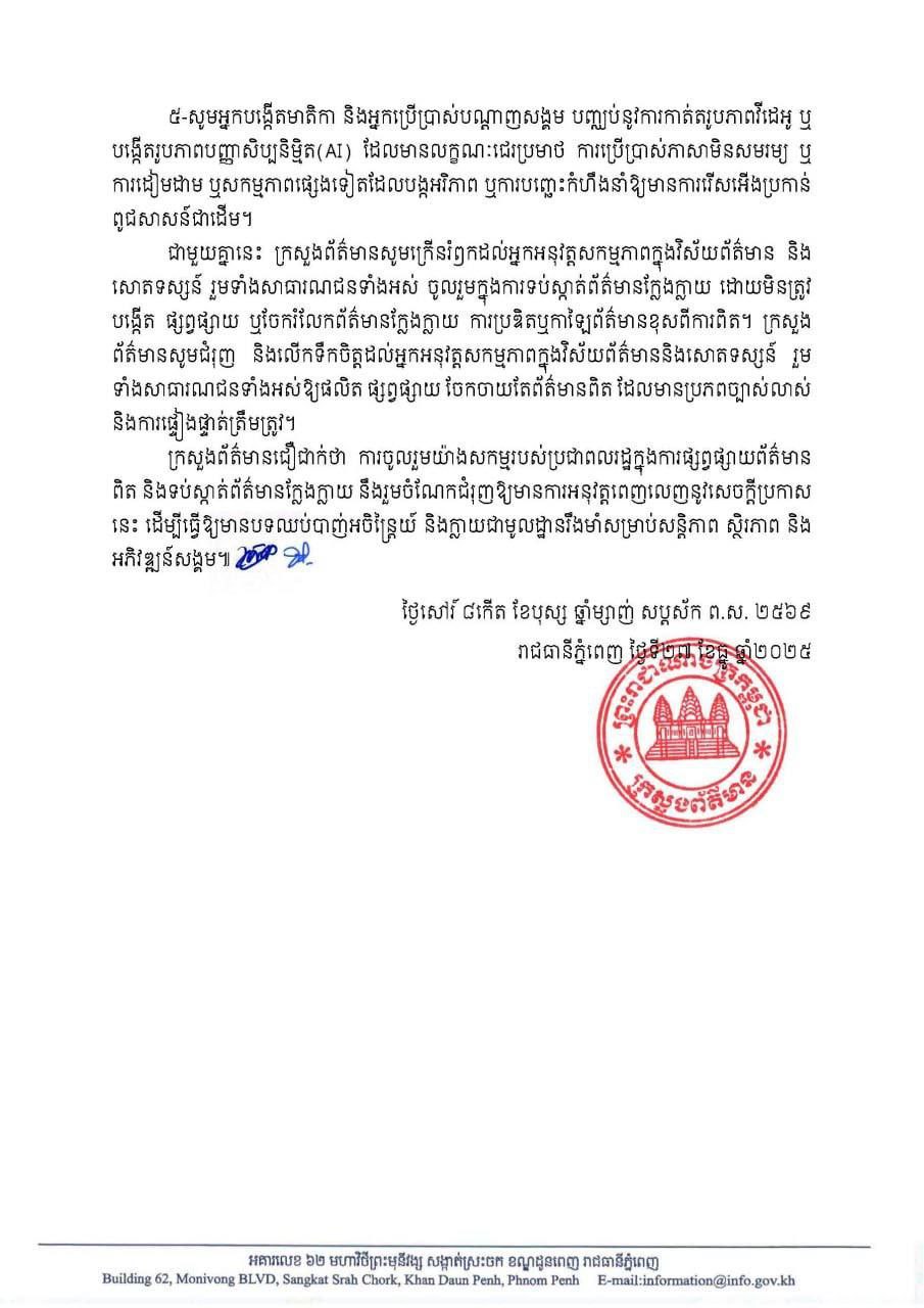 សេចក្តីណែនាំរបស់ក្រសួងព័ត៌មានស្តីពីការ ផ្សព្វផ្សាយនិងចែករំលែកព័ត៌មានដោយ ការទទួលខុសត្រូវនិងទប់ស្កាត់ព័ត៌មានក្លែងក្លាយ