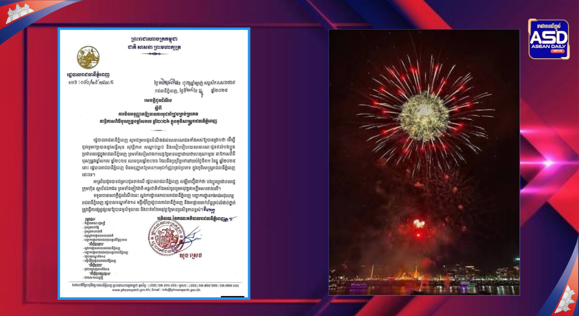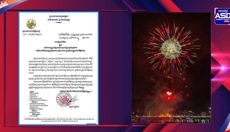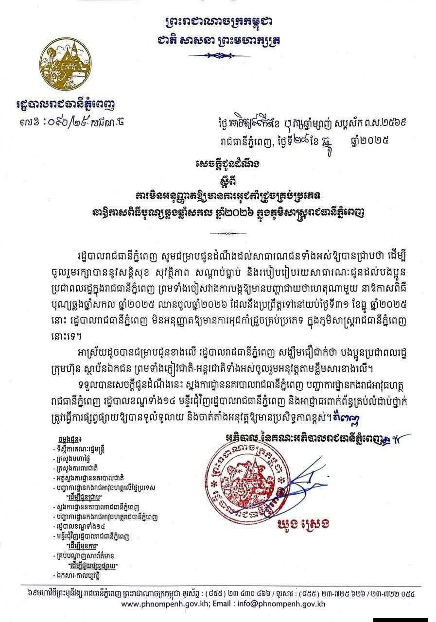 រដ្ឋបាលរាជធានីភ្នំពេញចេញសេចក្តីជូនដំណឹង ស្តីពីការមិនអនុញ្ញាតឱ្យមានការអុជកាំជ្រួចគ្រប់ប្រភេទ នាឱកាសពិធីបុណ្យឆ្លងឆ្នាំសកល ឆ្នាំ២០២៦ ដែលនឹងប្រព្រឹត្តទៅនៅយប់ថ្ងៃទី៣១ ខែធ្នូ ឆ្នាំ២០២៥ ក្នុងភូមិសាស្រ្តរាជធានីភ្នំពេញ ដើម្បីចូលរួមរក្សាបាននូវសន្តិសុខ សុវត្ថិភាព សណ្តាប់ធ្នាប់ និងរបៀបរៀបរយសាធារណៈជូនដល់បងប្អូនប្រជាពលរដ្ឋក្នុងរាជធានីភ្នំពេញ ព្រមទាំងចៀសវាងការបង្កឱ្យមានបញ្ហាជាយថាហេតុ៕
