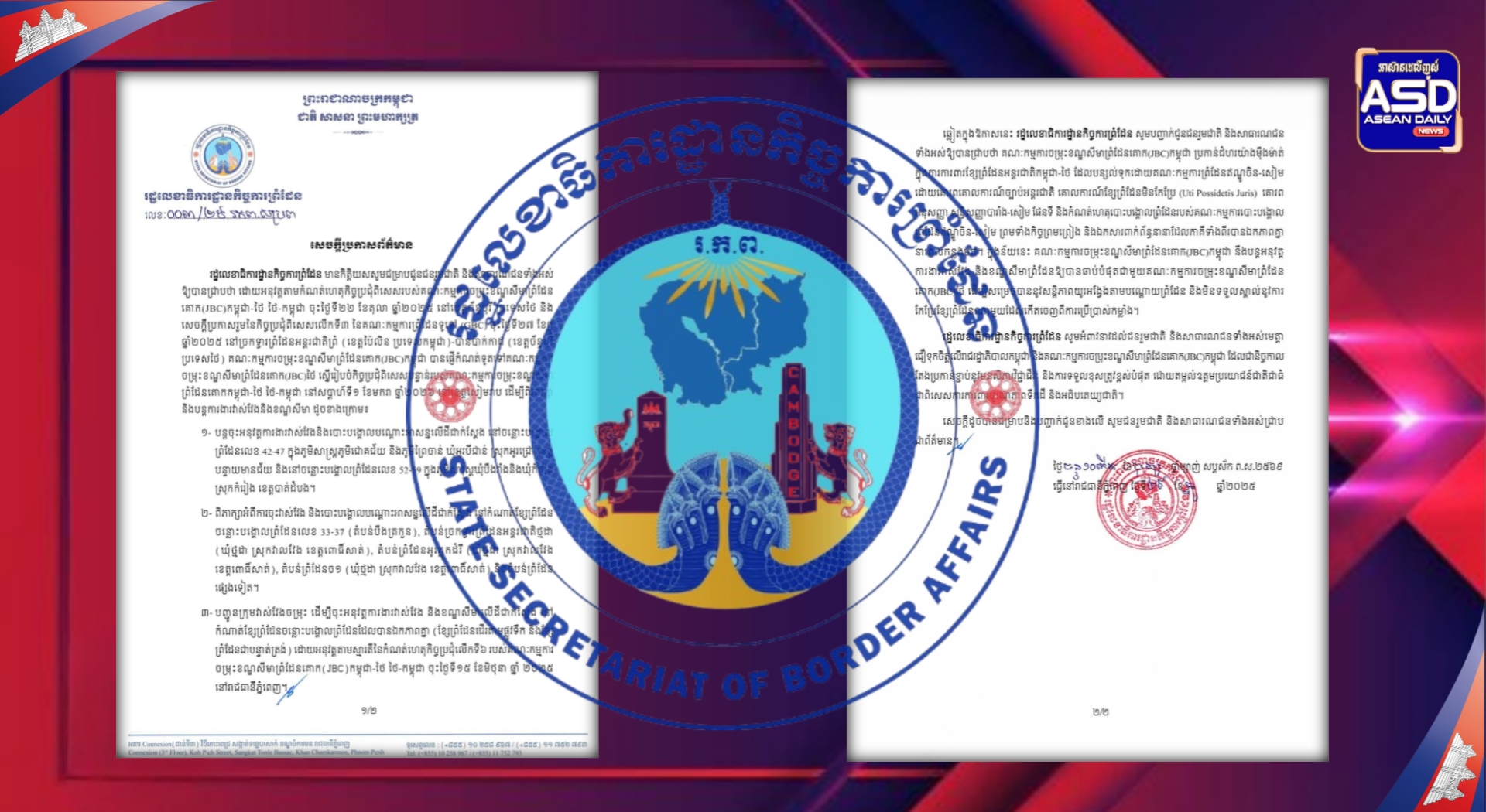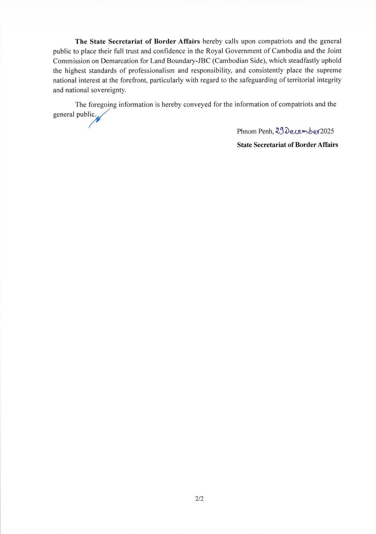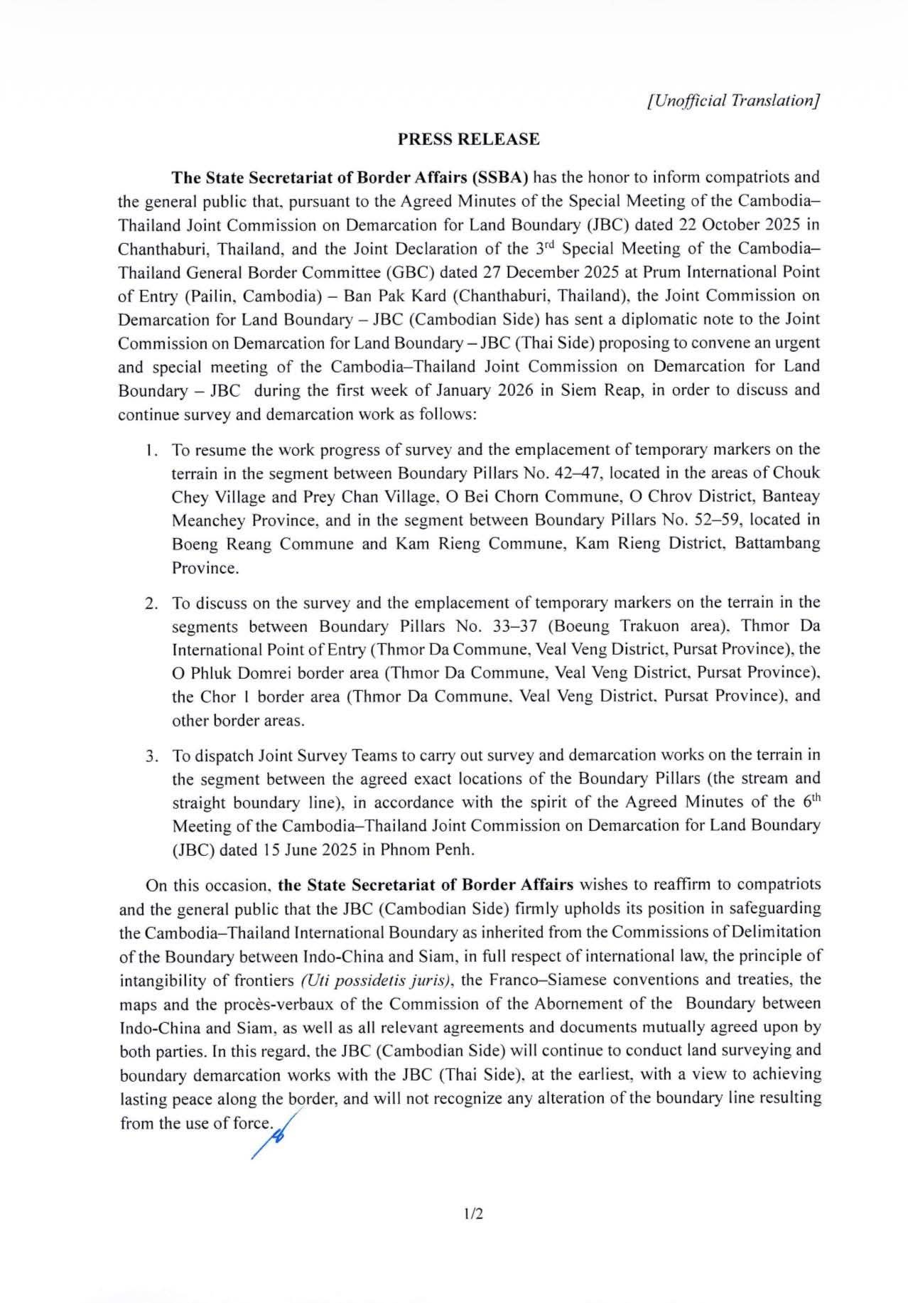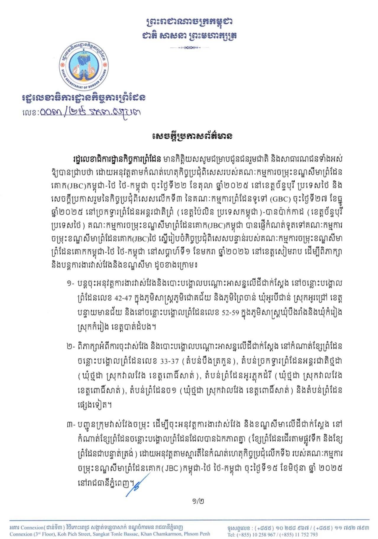 រដ្ឋលេខាធិការដ្ឋានកិច្ចការព្រំដែន | គណៈកម្មការចម្រុះខណ្ឌសីមាព្រំដែនគោក (JBC) កម្ពុជា បានផ្ញើកំណត់ទូតទៅគណៈកម្មការចម្រុះខណ្ឌសីមាព្រំដែនគោក (JBC) ថៃ ស្នើរៀបចំកិច្ចប្រជុំពិសេសបន្ទាន់របស់គណៈកម្មការចម្រុះខណ្ឌសីមា ព្រំដែនគោកកម្ពុជា-ថៃ ថៃ-កម្ពុជា នៅសប្តាហ៍ទី១ ខែមករា ឆ្នាំ២០២៦ នៅខេត្តសៀមរាប ដើម្បីពិភាក្សា និងបន្តការងារវាស់វែងនិងខណ្ឌសីមា។ The State Secretariat of Border Affairs (SSBA) | The Joint Commission on Demarcation for Land Boundary – JBC (Cambodian Side) has sent a diplomatic note to the Joint Commission on Demarcation for Land Boundary – JBC (Thai Side) proposing to convene an urgent and special meeting of the Cambodia-Thailand Joint Commission on Demarcation for Land Boundary – JBC during the first week of January 2026 in Siem Reap, in order to discuss and continue survey and demarcation work.