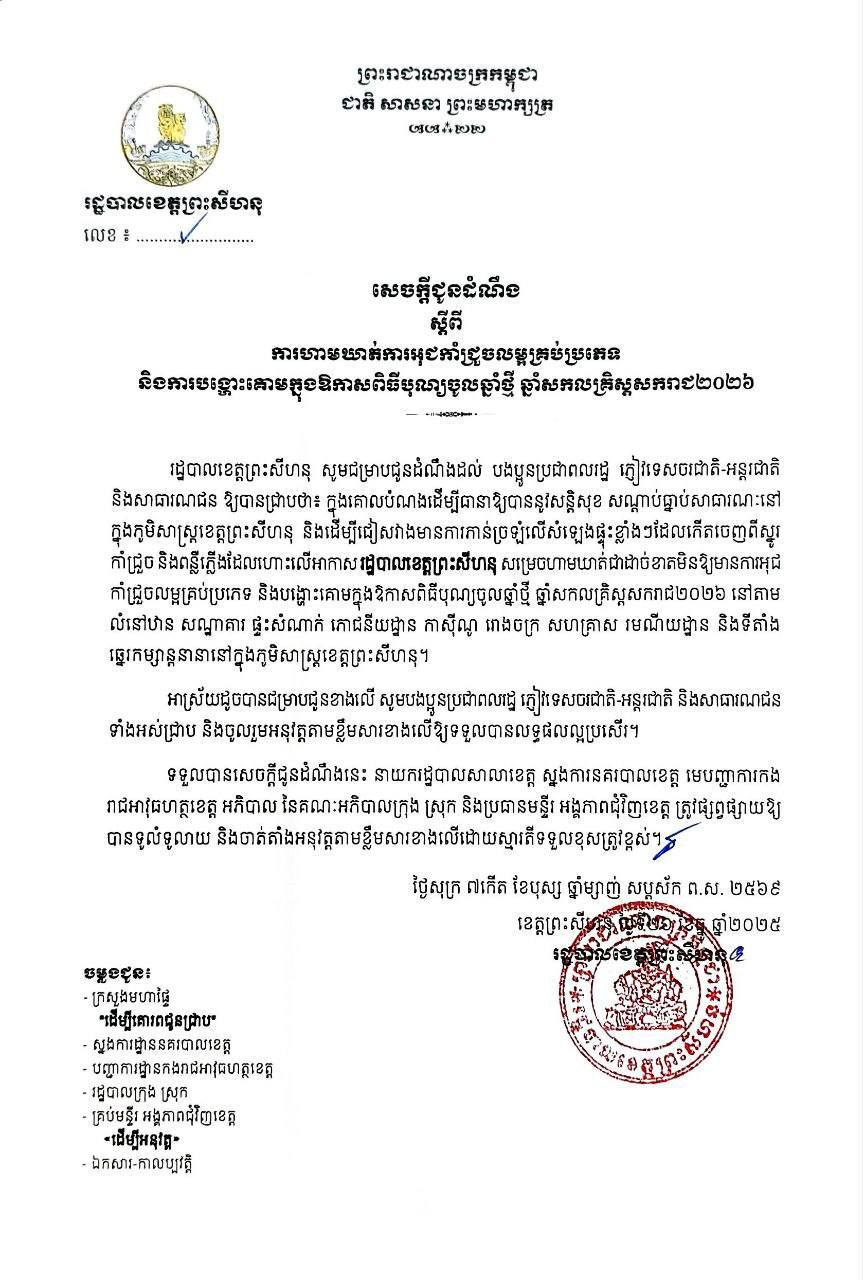 រដ្ឋបាលខេត្តព្រះសីហនុចេញសេចក្តីជូនដំណឹង ស្តីពី ការហាមឃាត់ការអុជកាំជ្រួចលម្អគ្រប់ប្រភេទ និងការបង្ហោះគោមក្នុងឱកាសពិធីបុណ្យចូលឆ្នាំថ្មី ឆ្នាំសកលគ្រិស្តសករាជ២០២៦.