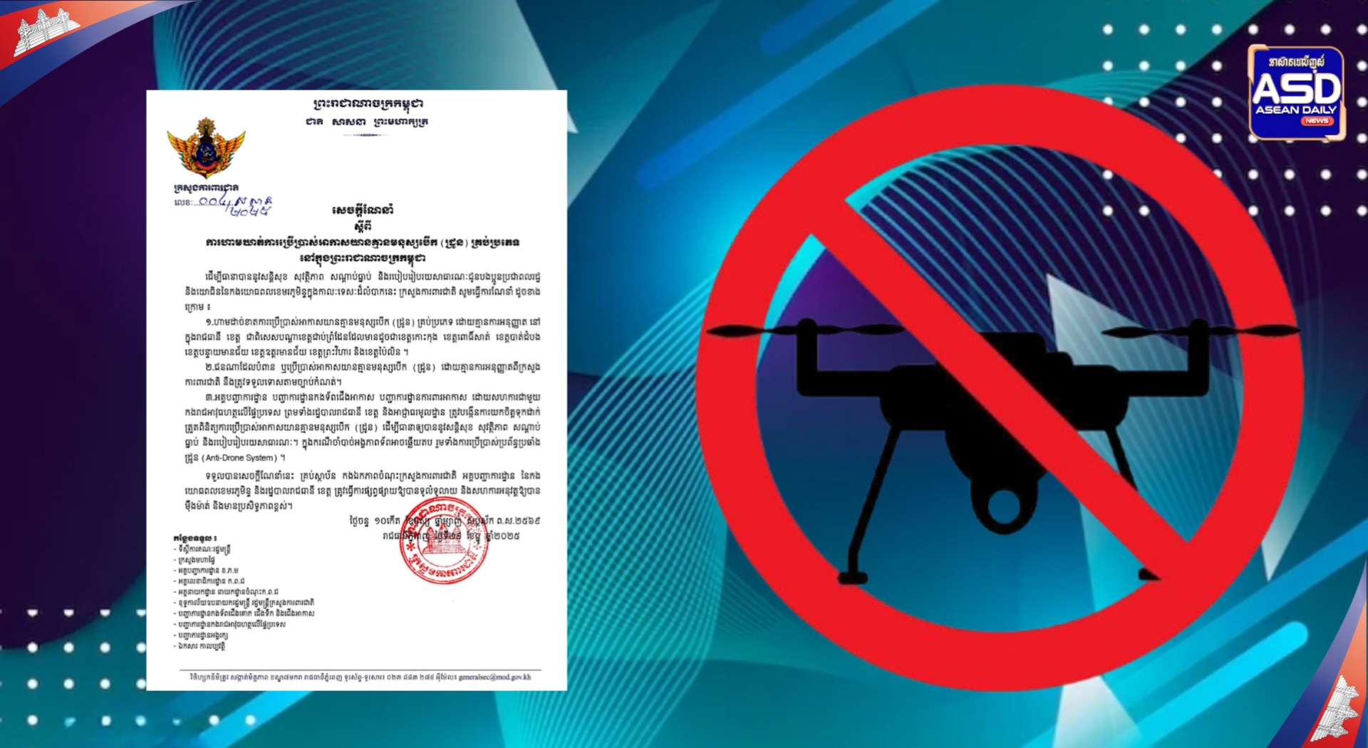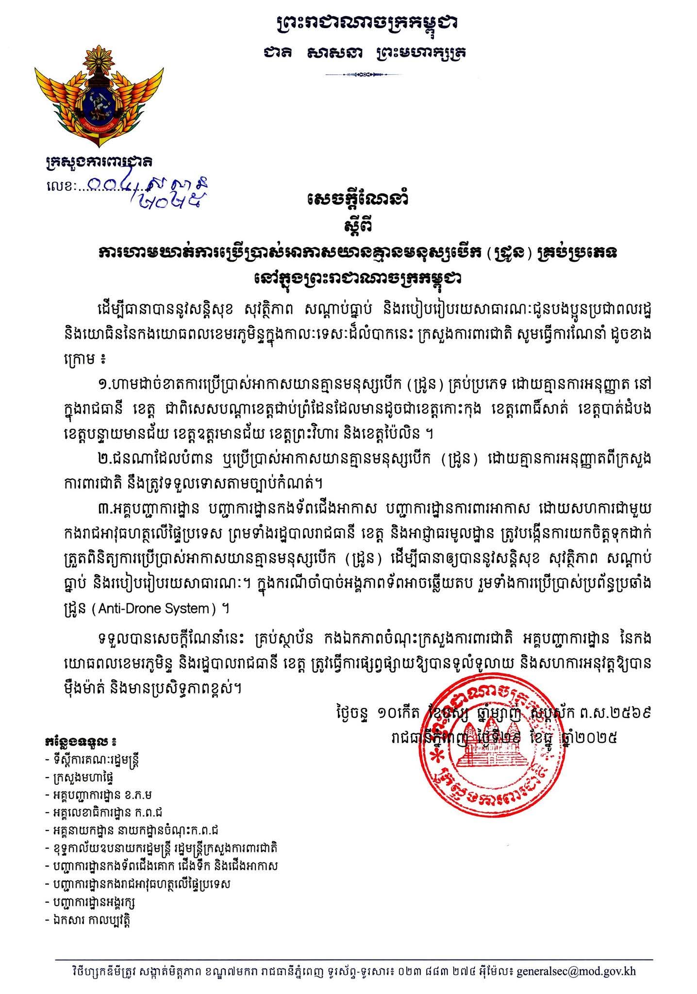 ក្រសួងការពារជាតិបានចេញសេចក្តីណែនាំ ស្តីពីការហាមឃាត់ដាច់ខាតលើការប្រើប្រាស់អាកាសយានគ្មានមនុស្សបើក (ដ្រូន) គ្រប់ប្រភេទនៅទូទាំងប្រទេស ជាពិសេសតាមបណ្តាខេត្តជាប់ព្រំដែន។