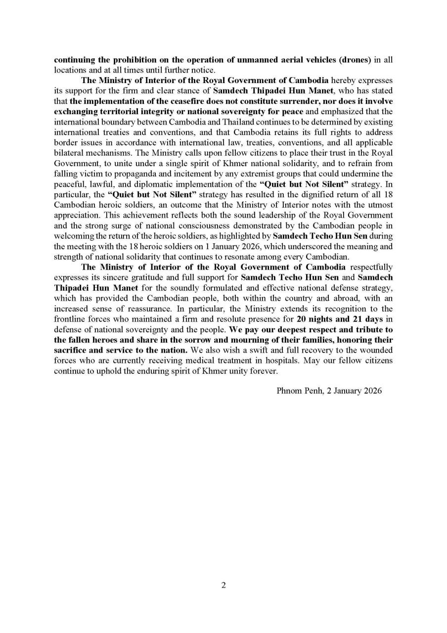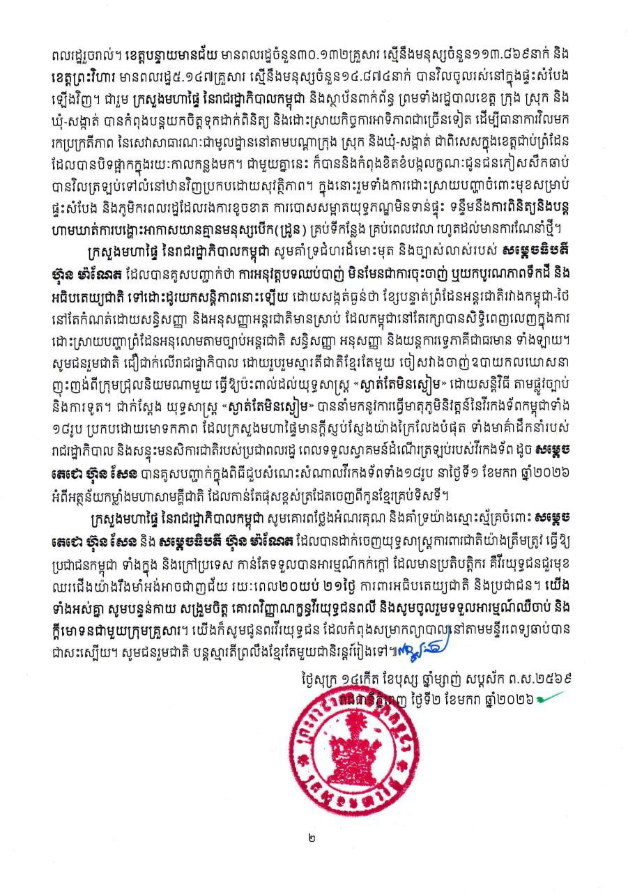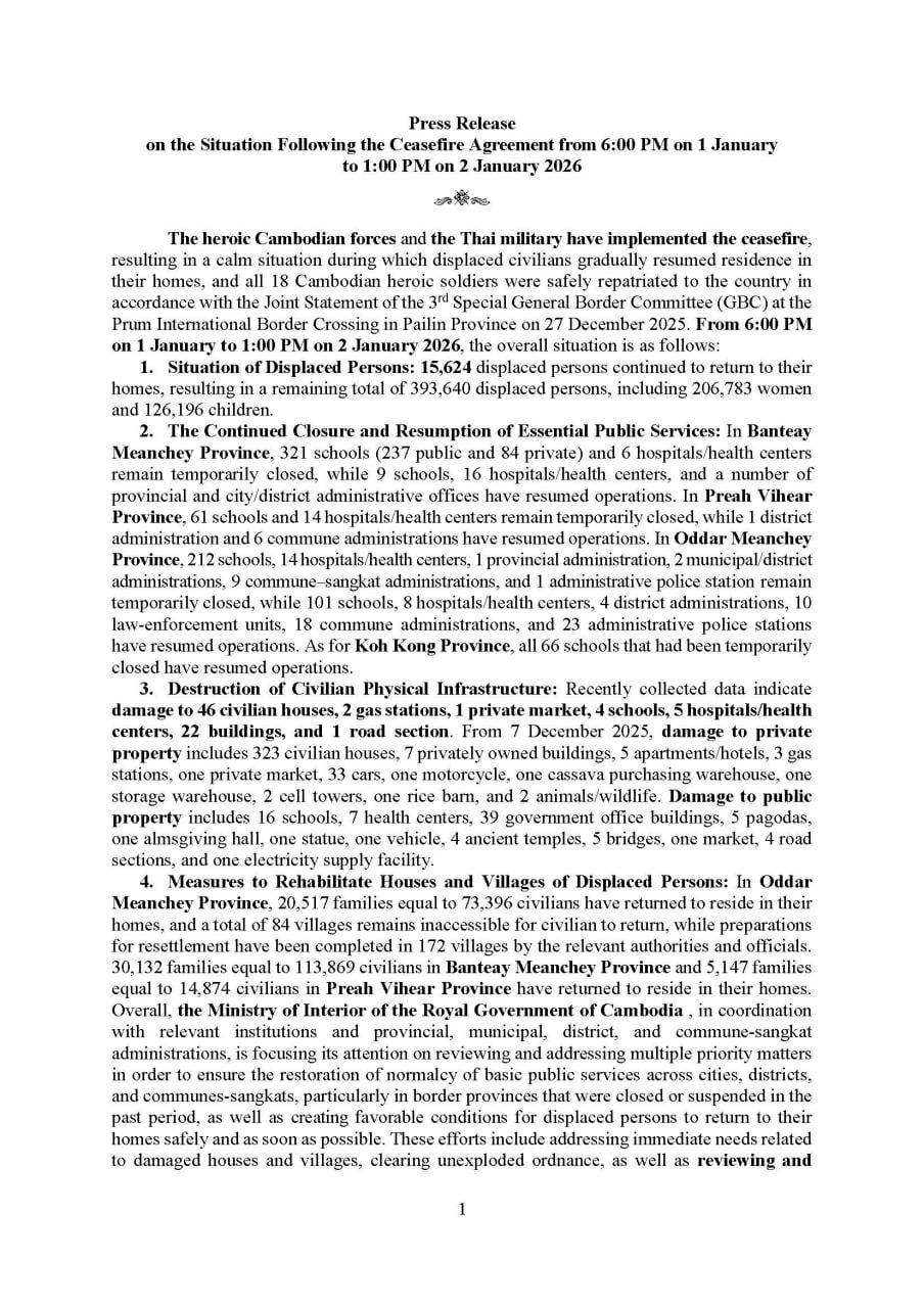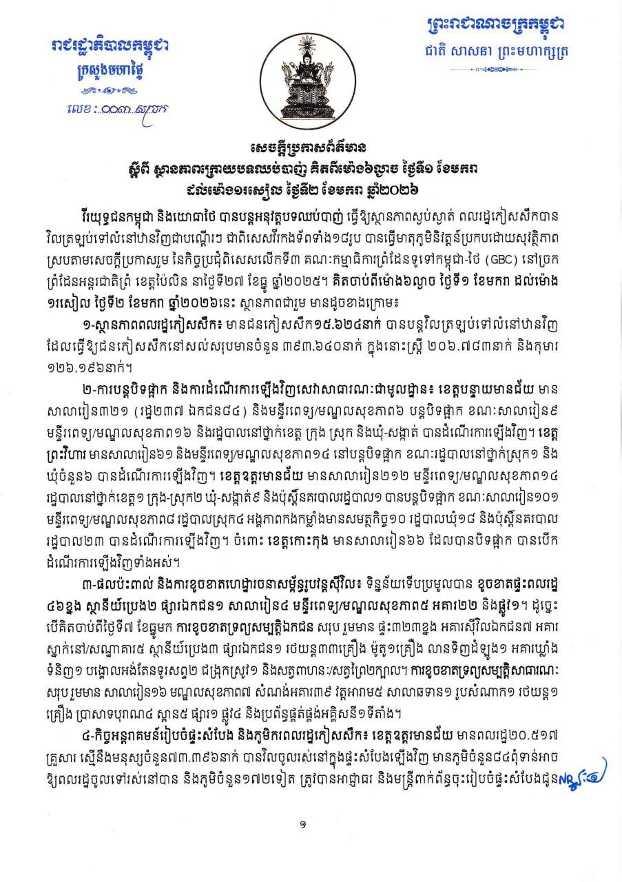 [English Below] គិតពីម៉ោង៦ល្ងាចថ្ងៃទី១ ដល់ម៉ោង១រសៀល ថ្ងៃទី២ ខែមករា ឆ្នាំ២០២៦នេះ មានជនភៀសសឹក១៥.៦២៤នាក់ បានបន្តវិលត្រឡប់ទៅលំនៅឋានវិញ ដែលធ្វើឱ្យជនភៀសសឹកនៅសល់សរុបមានចំនួន ៣៩៣.៦៤០នាក់ ក្នុងនោះស្រី្ត ២០៦.៧៨៣នាក់ និងកុមារ១២៦.១៩៦នាក់។ From 6:00 PM on 1 January to 1:00 PM on 2 January 2026, 15,624 displaced persons continued to return to their homes, resulting in a remaining total of 393,640 displaced persons, including 206,783 women and 126,196 children.