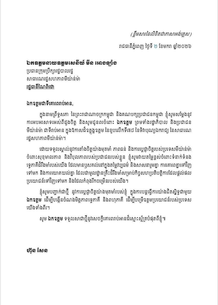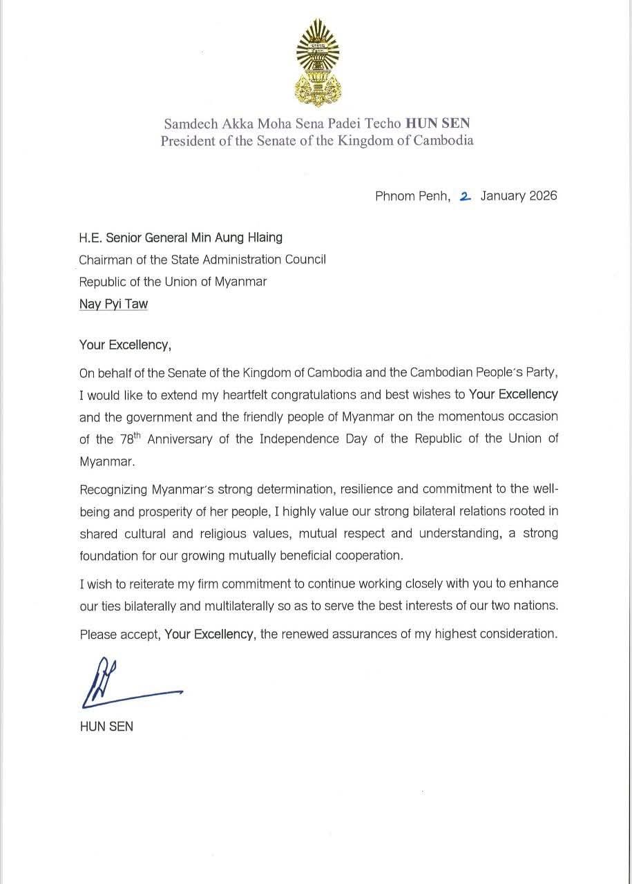 សម្តេចអគ្គមហាសេនាបតីតេជោ ហ៊ុន សែន ប្រធានព្រឹទ្ធសភានៃព្រះរាជាណាចក្រកម្ពុជា ផ្ញើសារលិខិតអបអរសាទរជូន ឯកឧត្តមនាយឧត្តមសេនីយ៍ Min Aung Hlaing ប្រធានក្រុមប្រឹក្សារដ្ឋបាលរដ្ឋ នៃសាធារណរដ្ឋសហភាពមីយ៉ាន់ម៉ា ក្នុងឱកាសខួបលើកទី៧៨ នៃទិវាបុណ្យឯករាជ្យ នៃសាធារណរដ្ឋសហភាពមីយ៉ាន់ម៉ា។
