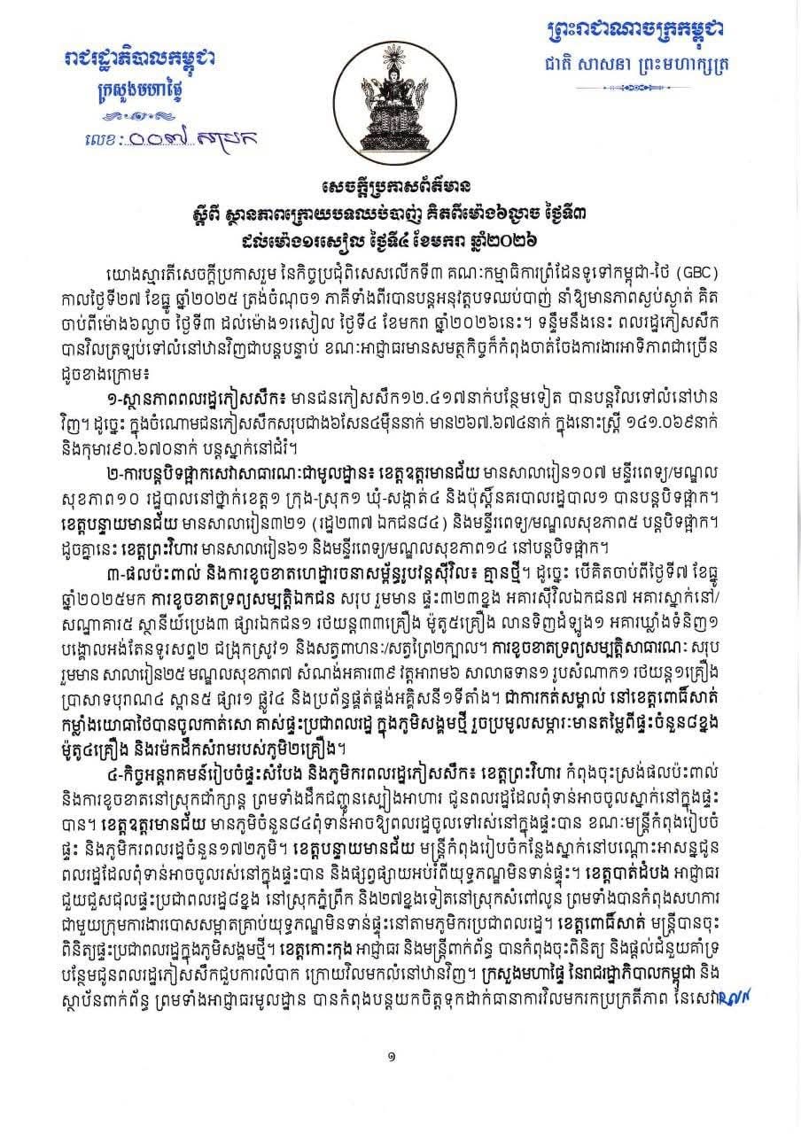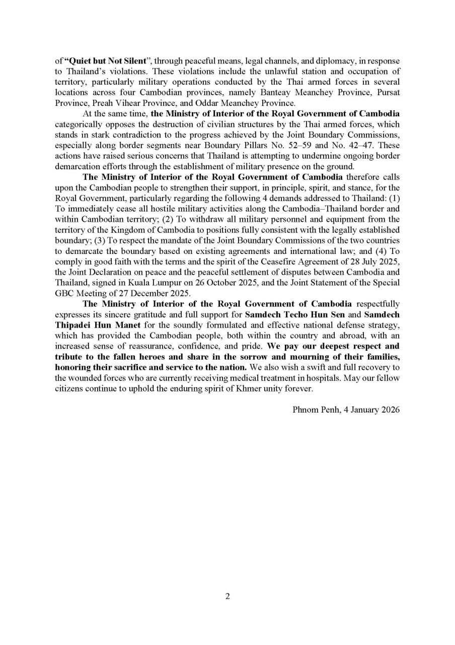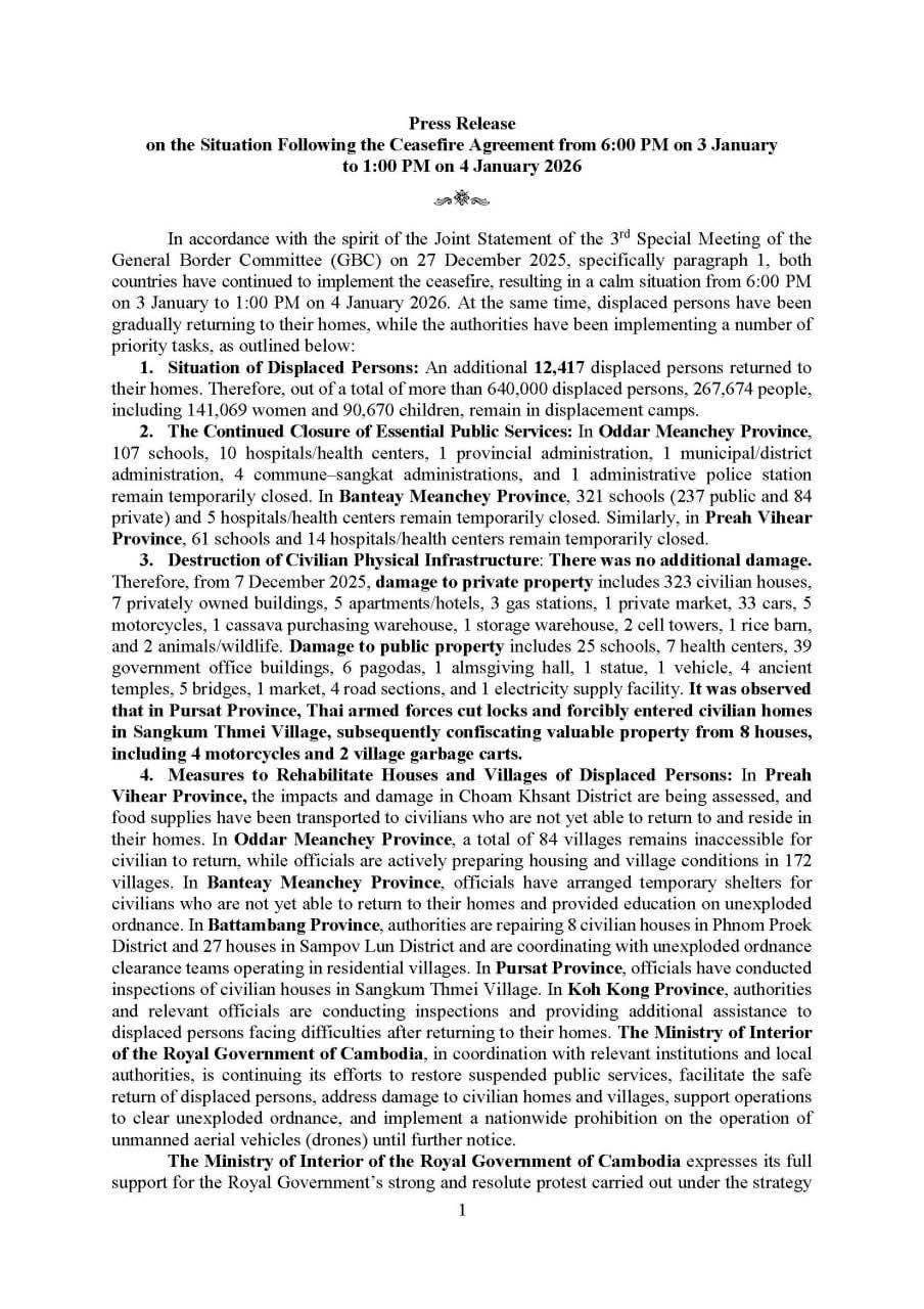 ក្រសួងមហាផ្ទៃ|គិតពីម៉ោង៦ល្ងាចថ្ងៃទី៣ ដល់ម៉ោង១រសៀល ថ្ងៃទី៤ ខែមករា ឆ្នាំ២០២៦នេះ មានជនភៀសសឹក១២.៤១៧នាក់បន្ថែមទៀត បានបន្តវិលទៅលំនៅឋានវិញ។ ដូច្នេះ ក្នុងចំណោមជនភៀសសឹកសរុបជាង៦សែននាក់ មាន២៦៧.៦៧៤នាក់ ក្នុងនោះស្រី្ត ១៤១.០៦៩នាក់ និងកុមារ៩០.៦៧០នាក់ បន្តស្នាក់នៅជំរំ៕ From 6:00 PM on January 3 to 1:00 PM on January 4, 2026, an additional 12,417 displaced persons continued to return to their homes. As a result, out of a total of more than 600,000 displaced persons, 267,674 people – including 141,069 women and 90,670 children – remain staying in camps.