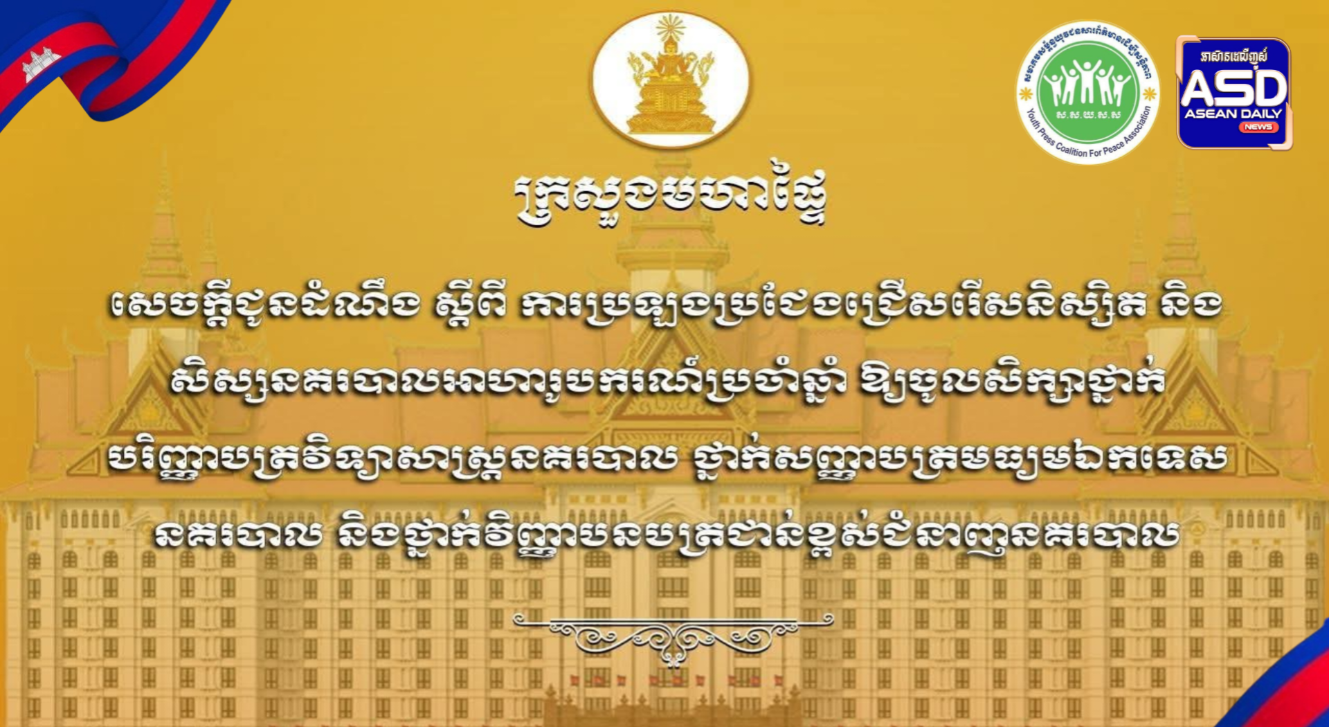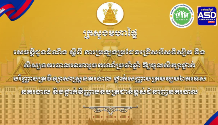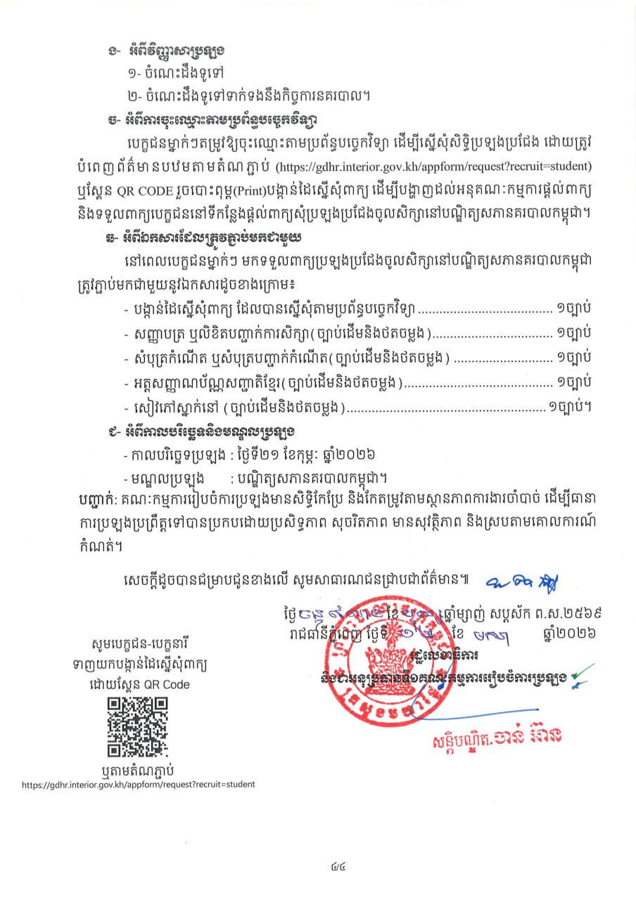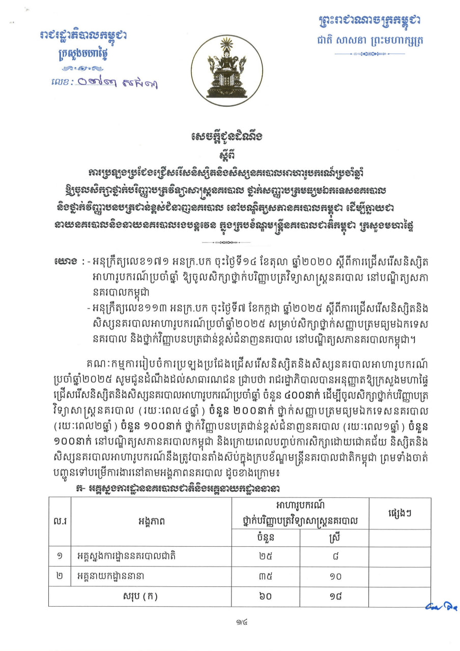 ក្រសួងមហាផ្ទៃប្រកាសជ្រើសរើសនិស្សិត និងសិស្សនគរបាលអាហារូបករណ៍ប្រចាំឆ្នាំ ចំនួន ៤០០នាក់។ ព័ត៌មានជាតិ ដោយ អាស៊ាន ដេលី ថ្ងៃទី 13 ខែ ខែមករា ឆ្នាំ 2026 5 ផ្សាយ:ថ្ងៃទី១៣ ខែមករា ឆ្នាំ២០២៦ ដោយ:សៅ វាសនា(HarryVS) 5 ចែករំលែក