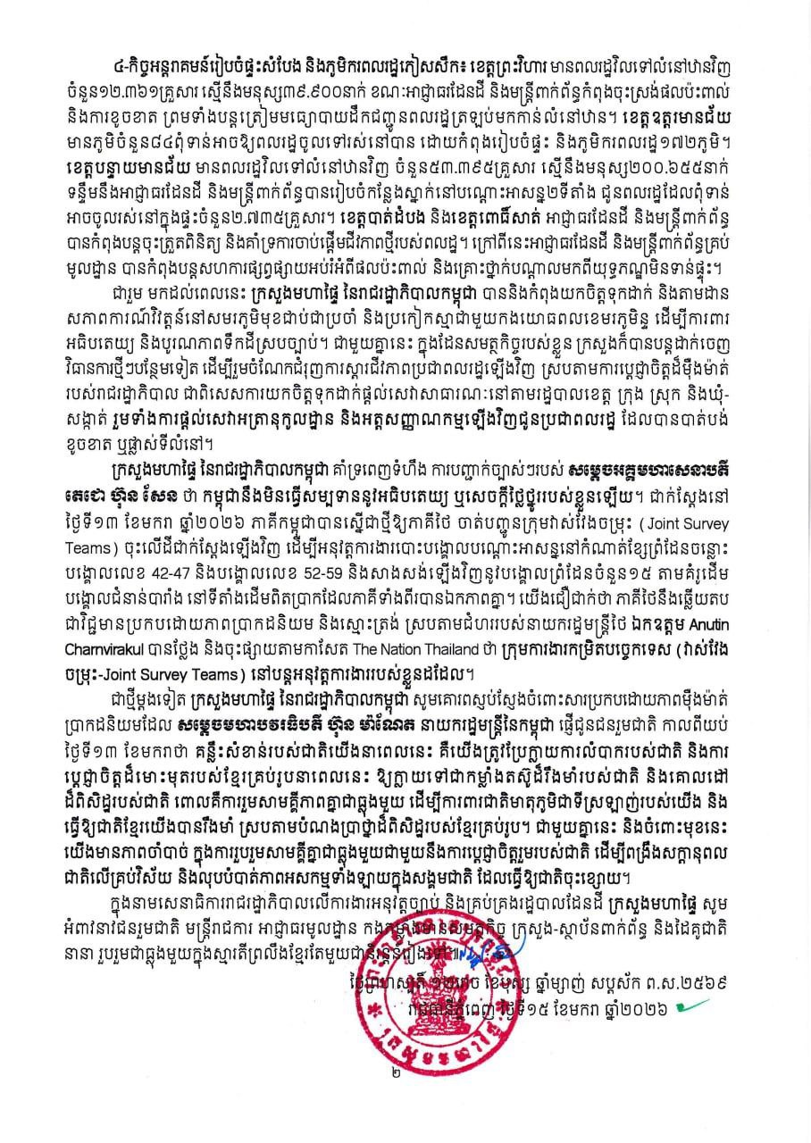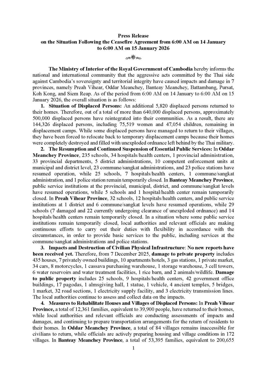ក្រសួង​មហាផ្ទៃ​|មាន​ពលរដ្ឋ​ភៀសសឹក​​៥.៨២០នាក់បន្ថែមទៀត បាន​​បន្ត​វិលត្រឡប់​ទៅលំនៅឋានវិញ។ ក្នុងចំណោមពលរដ្ឋភៀសសឹក​​សរុបជាង ៦សែន ៤ម៉ឺន​នាក់ មានជាង ៥សែន​នាក់ បានវិលត្រឡប់ទៅលំនៅឋានវិញ​។ ពលរដ្ឋភៀសសឹកបន្តស្នាក់នៅជំរំមាន​ចំនួន​​ ១៤៤.៣២៦នាក់​។ An additional 5,820 displaced persons returned to their homes. Therefore, out of a total of more than 640,000 displaced persons, approximately 500,000 displaced persons have reintegrated into their communities. As a result, there are 144,326 displaced persons remaining in displacement camps.