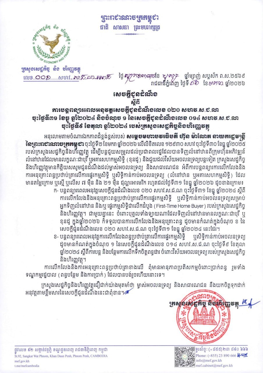 រាជរដ្ឋាភិបាលសម្រេចបន្តពន្យារការលើកលែង និង ការអនុគ្រោះពន្ធប្រថាប់ត្រាលើការផ្ទេរ កម្មសិទ្ធិ ឬសិទ្ធិកាន់កាប់អចលនទ្រព្យ (លំនៅឋាន ឬអគារសហកម្មសិទ្ធិ) ដែល មានតម្លៃក្រោម ឬស្មើ ឬលើស ៧ ម៉ឺន និង ២១ ម៉ឺន ដុល្លារអាមេរិក រហូតដល់ថ្ងៃទី៣១ ខែធ្នូ ឆ្នាំ២០២៦។