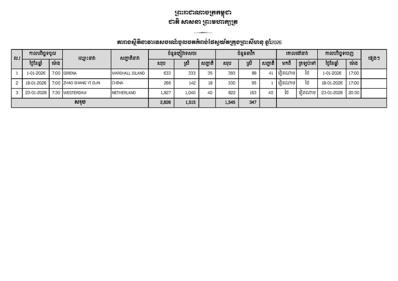 (ខេត្ត​ព្រះសីហនុ)​: នៅវេលាម៉ោង ០៧:៣០នាទី ថ្ងៃទី ២៣ ខែមករា ឆ្នាំ២០២៦ នាវាទេសចរណ៍ចំនួន ១ គ្រឿង ឈ្មោះ WESTERDAM សញ្ជាតិ NETHER LAND បានចូលចតដល់កំពង់ផែស្វយ័តក្រុងព្រះសីហនុ ដោយ​សុវត្ថិភាព​។