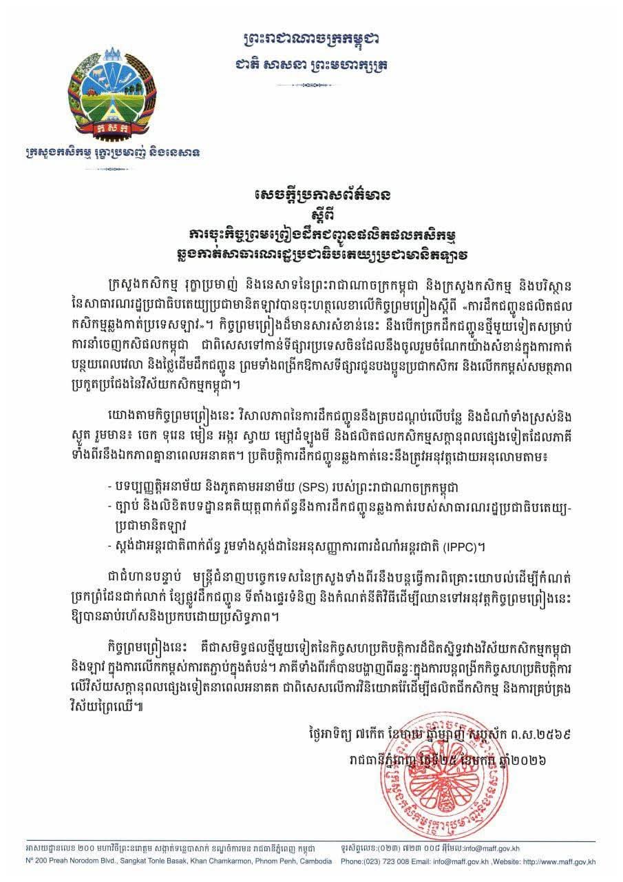 សេចក្ដីប្រកាសព័ត៌មាន ស្ដីពីការចុះកិច្ចព្រមព្រៀងដឹកជញ្ជូនផលិតផលកសិកម្មឆ្លងកាត់សាធារណរដ្ឋប្រជាធិបតេយ្យប្រជាមានិតឡាវ