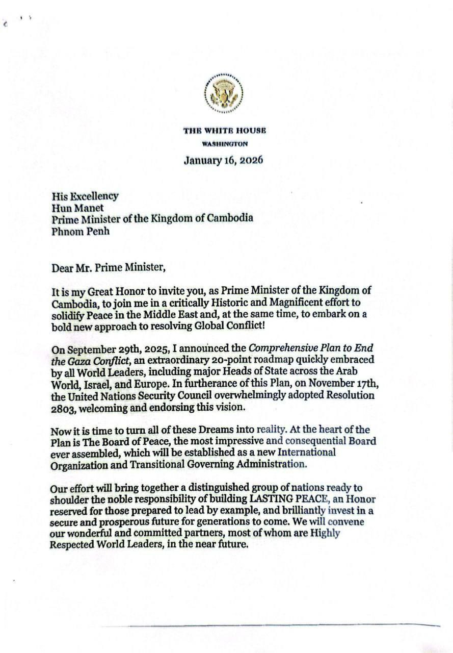 សម្តេចធិបតី៖ កម្ពុជាសម្រេចចូលរួមជាសមាជិក ស្ថាបនិកនៃក្រុមប្រឹក្សាសន្តិភាព (The Board of Peace) តាមការអញ្ជើញរបស់ឯកឧត្តមប្រធានាធិបតី សហរដ្ឋអាមេរិក Donald J. Trump កាលពីថ្ងៃ ទី១៦ ខែមករា ឆ្នាំ២០២៦។