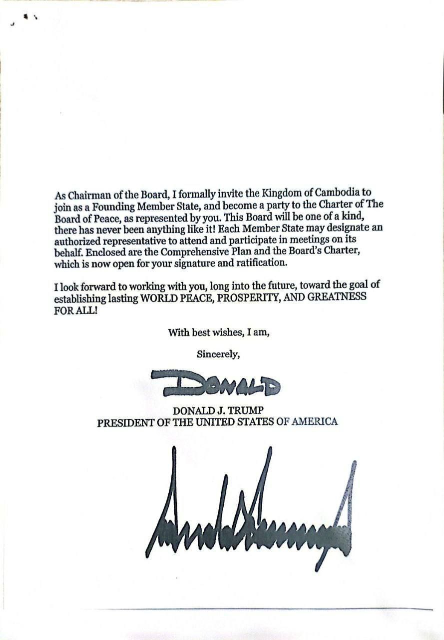 កម្ពុជាសម្រេចចូលរួមជាសមាជិកស្ថាបនិកនៃក្រុមប្រឹក្សាសន្តិភាព (The Board of Peace) តាមការអញ្ជើញរបស់ឯកឧត្តមប្រធានាធិបតីសហរដ្ឋអាមេរិក Donald J. Trump កាលពីថ្ងៃ ទី១៦ ខែមករា ឆ្នាំ២០២៦។