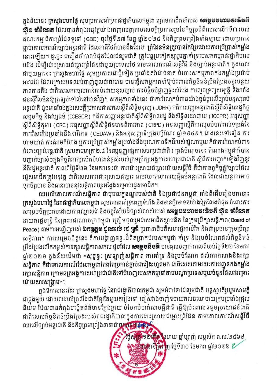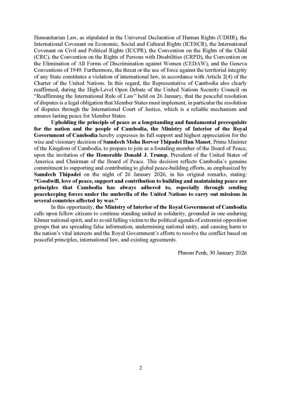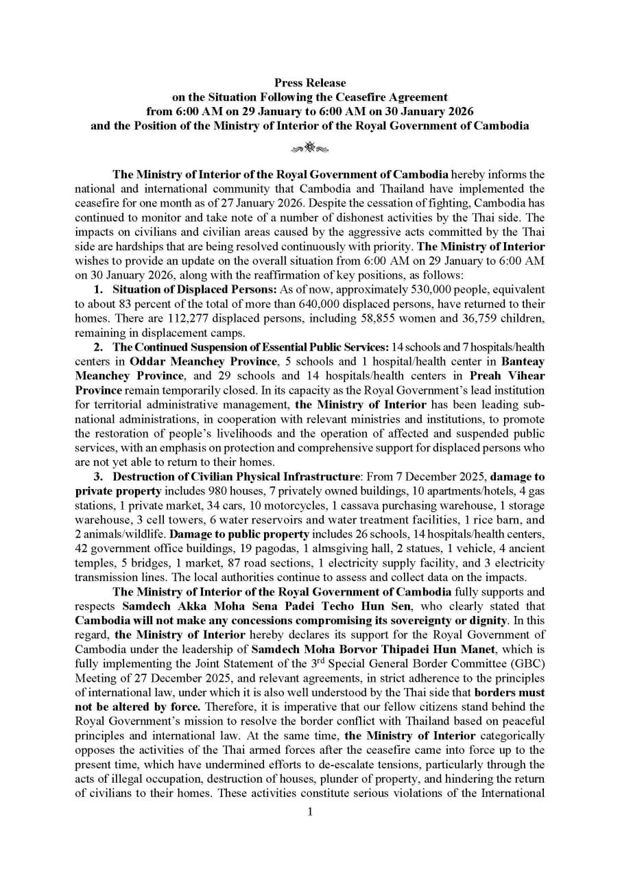 ក្រសួងមហាផ្ទៃ|សេចក្តីប្រកាសព័ត៌មាន ស្តីពីស្ថានភាពពលរដ្ឋភៀសសឹក ផលប៉ះពាល់ លើតំបន់ស៊ីវិល គិតពីម៉ោង៦ព្រឹក ថ្ងៃទី២៩ ដល់ម៉ោង៦ព្រឹក ថ្ងៃទី៣០ ខែមករា ឆ្នាំ២០២៦ និងគោលជំហរក្រសួងមហាផ្ទៃ នៃរាជរដ្ឋាភិបាល កម្ពុជា! Press Release on the Situation Following the Ceasefire Agreement from 6:00 AM on 29 January to 6:00 AM on 30 January 2026 and the Position of the Ministry of Interior of the Royal Government of Cambodia.
