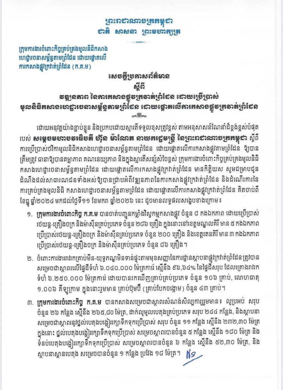 សេចក្តីប្រកាសព័ត៌មាន ស្តីពី វឌ្ឍនភាពនៃការកសាងផ្លូវក្រវាត់ ព្រំដែន ដោយប្រើប្រាស់ មូលនិធិកសាងហេដ្ឋារចនាសម្ព័ន្ធតាម ព្រំដែន ដោយផ្តោតលើការកសាងផ្លូវក្រវាត់ព្រំដែន។