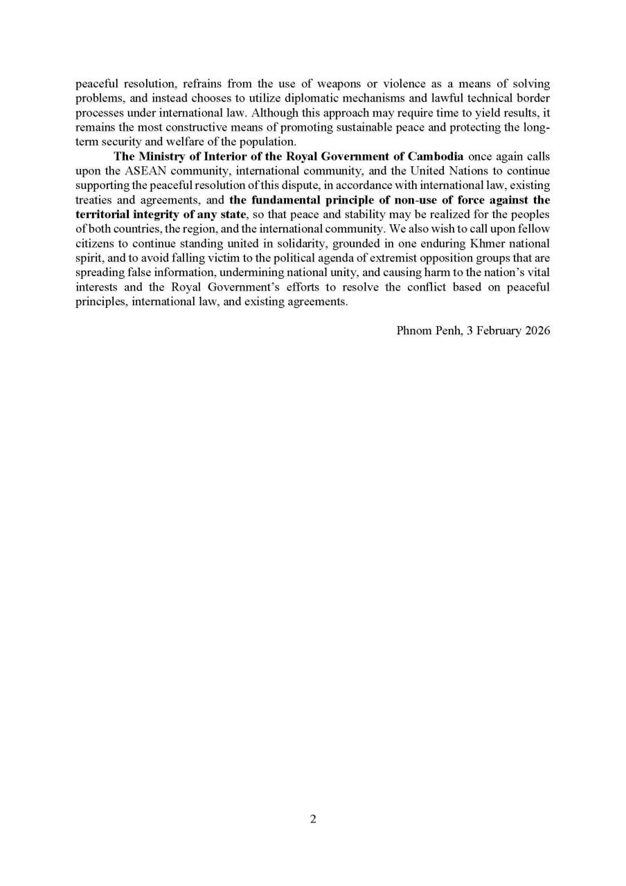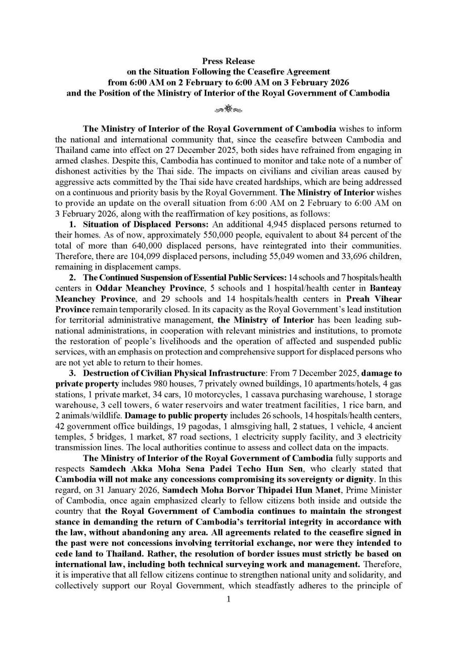 ក្រសួងមហាផ្ទៃ|គិតត្រឹមព្រឹកថ្ងៃទី៣ ខែកុម្ភៈ ឆ្នាំ២០២៦ មានពលរដ្ឋភៀសសឹក ៤.៩៤៥នាក់ បន្ថែមទៀត បានបន្តវិលត្រឡប់ទៅ លំនៅឋាន វិញ។ ក្នុងចំណោមពលរដ្ឋភៀសសឹកសរុបជាង ៦សែន ៤ម៉ឺននាក់ មានប្រមាណ ៥សែន ៥ម៉ឺន នាក់ ឬជិត ៨៤% បានវិលត្រឡប់ទៅលំនៅឋាន វិញ។ ដូច្នេះ មានពលរដ្ឋភៀសសឹកចំនួន ១០៤.០៩៩នាក់ទៀត កំពុងបន្តស្នាក់អាស្រ័យ តាមជំរំនានា។ As of the morning of 3 February 2026, an additional 4,945 displaced persons returned to their homes. As of now, approximately 550,000 people, equivalent to about 84 percent of the total of more than 640,000 displaced persons, have reintegrated into their communities. Therefore, there are 104,099 displaced persons remaining in displacement camps.