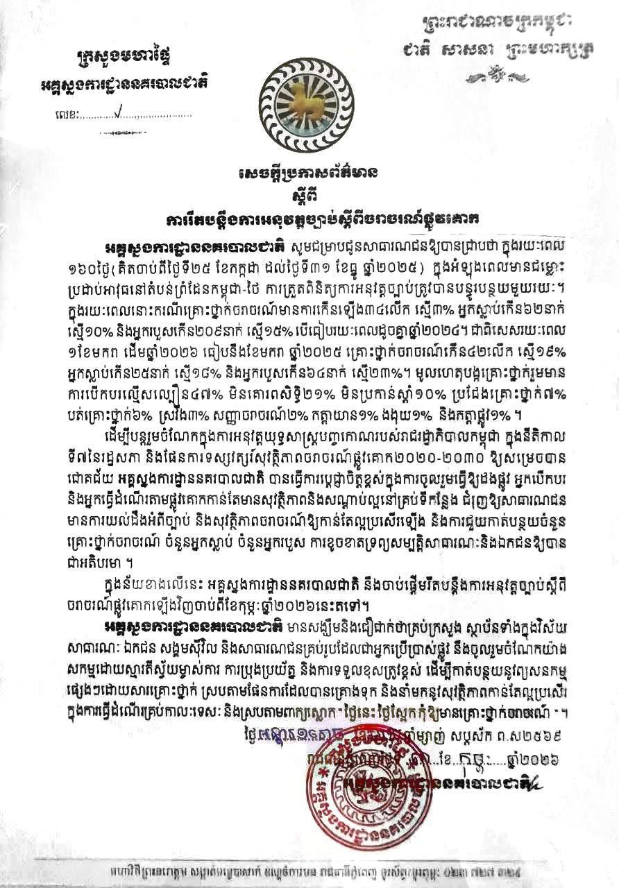 នគរបាលចរាចរណ៍ នឹងចាប់ផ្តើមរឹតបន្តឹង ការអនុវត្តច្បាប់ចរាចរណ៍ឡើងវិញ ចាប់ពីខែកុម្ភៈ ឆ្នាំ២០២៦ នេះវិញហើយ។