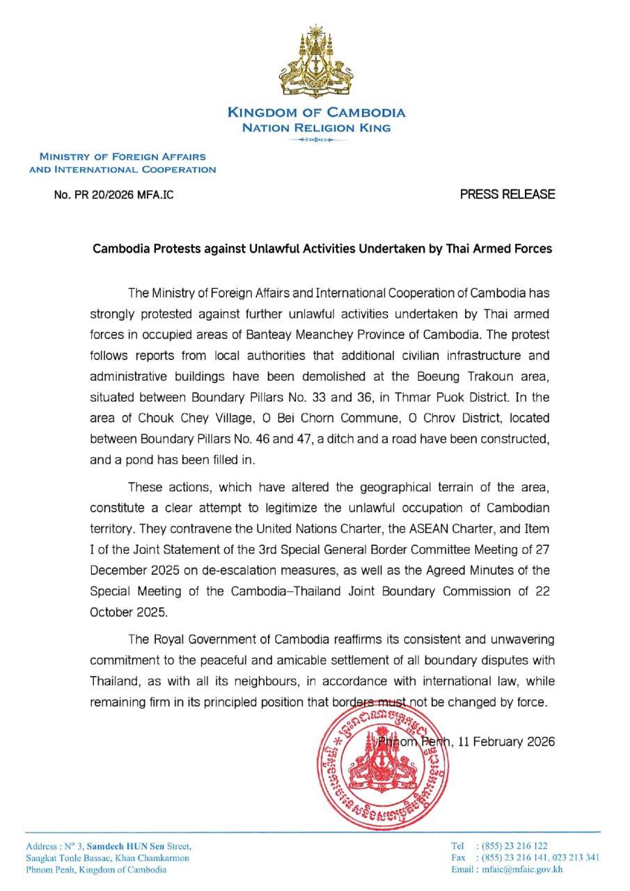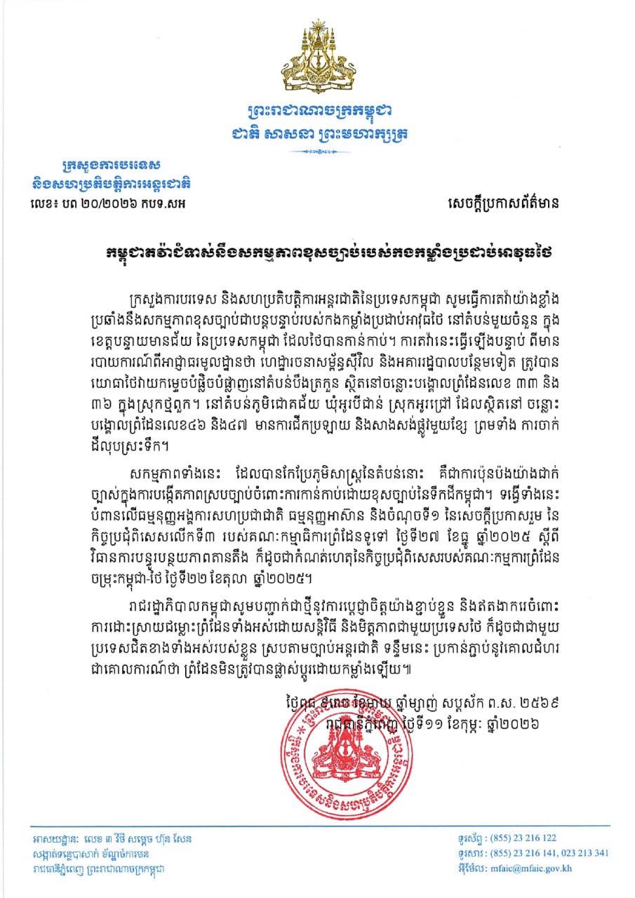 សេចក្តីប្រកាសព័ត៌មាន | កម្ពុជាតវ៉ាជំទាស់នឹង សកម្មភាពខុសច្បាប់របស់កងកម្លាំងប្រដាប់អាវុធ ថៃ. ព័ត៌មានជាតិ ដោយ អាស៊ាន ដេលី ថ្ងៃទី 12 ខែ ខែកុម្ភៈ ឆ្នាំ 2026 6 ផ្សាយ:ថ្ងៃទី១២ ខែកុម្ភៈ ឆ្នាំ២០២៦ ដោយ:សៅ វាសនា(HarryVS) 6 ចែករំលែក