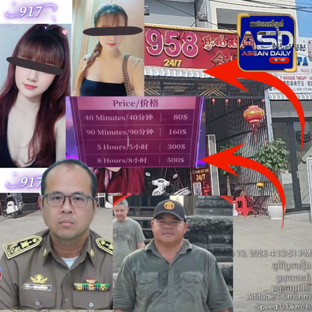 (ក្រុងសំពៅពូន):-ហាងម៉ាស្សា-958- តម្លៃសេវាខ្ពស់ខុសធម្មតា សញ្ញាសង្ស័យធ្ងន់ធ្ងរ.តើអធិការនគរបាលក្រុង និងអភិបាលក្រុងសំពៅពូន កំពុងធ្វើតួនាទីអ្វី? ការអនុវត្តច្បាប់ពេញលេញឬនៅ?