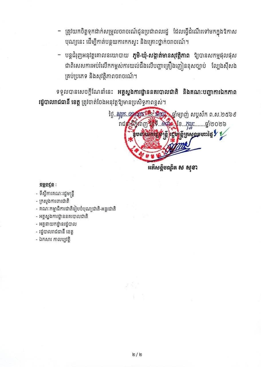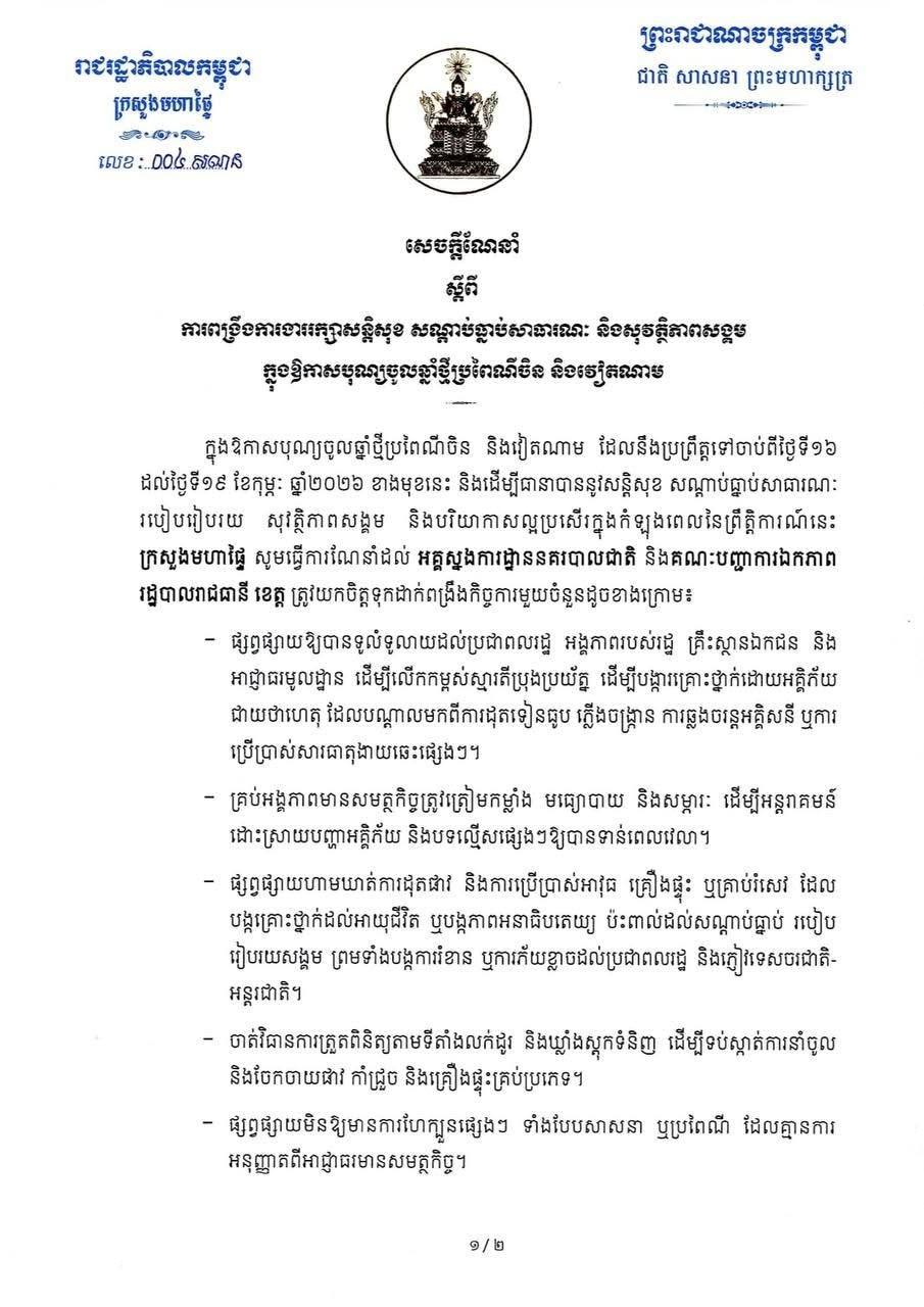 ប្រមុខ​ក្រសួង​មហាផ្ទៃ​ចេញសេចក្តីណែនាំ​ ស្តីពីការពង្រឹងការងាររក្សាសន្តិសុខ សណ្តាប់ធ្នាប់ សាធារណៈ និងសុវត្ថិភាពសង្គម ក្នុងឱកាស បុណ្យចូលឆ្នាំថ្មីប្រពៃណីចិន និងវៀតណាម ឆ្នាំ២០២៦!