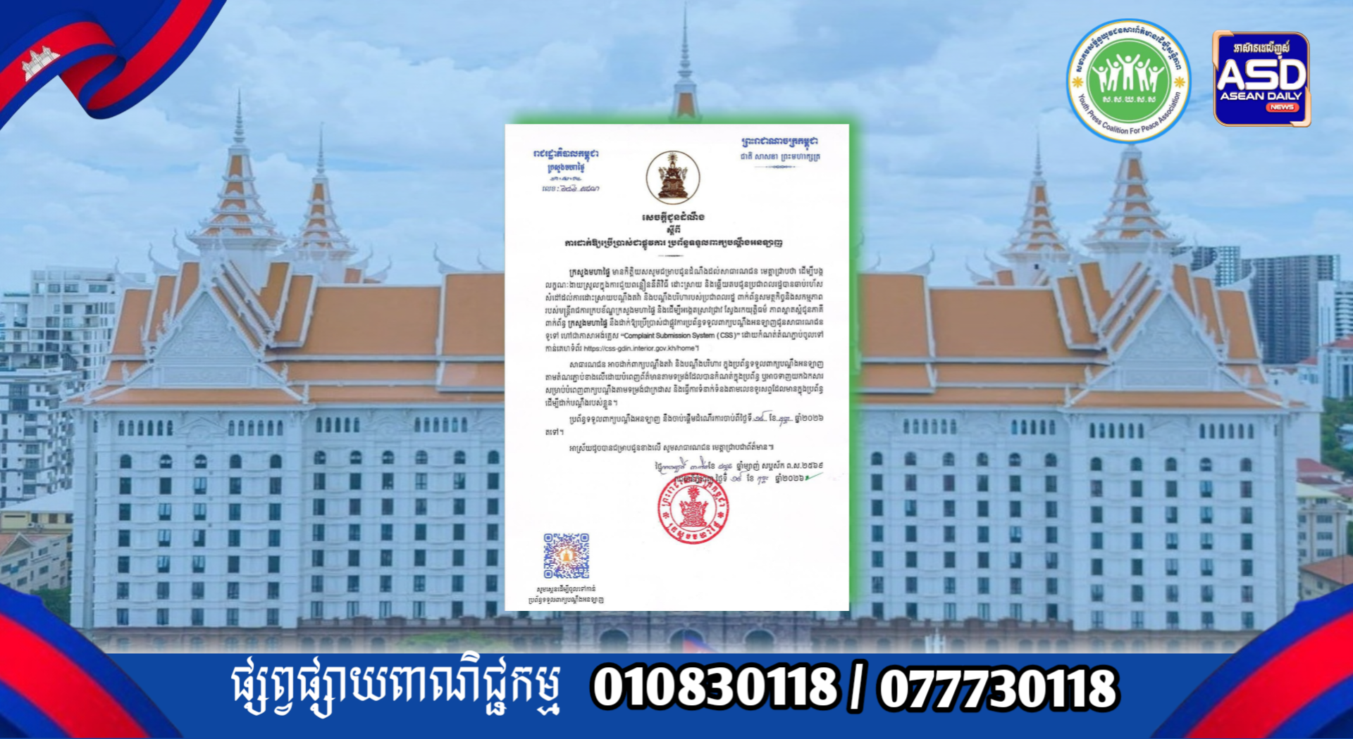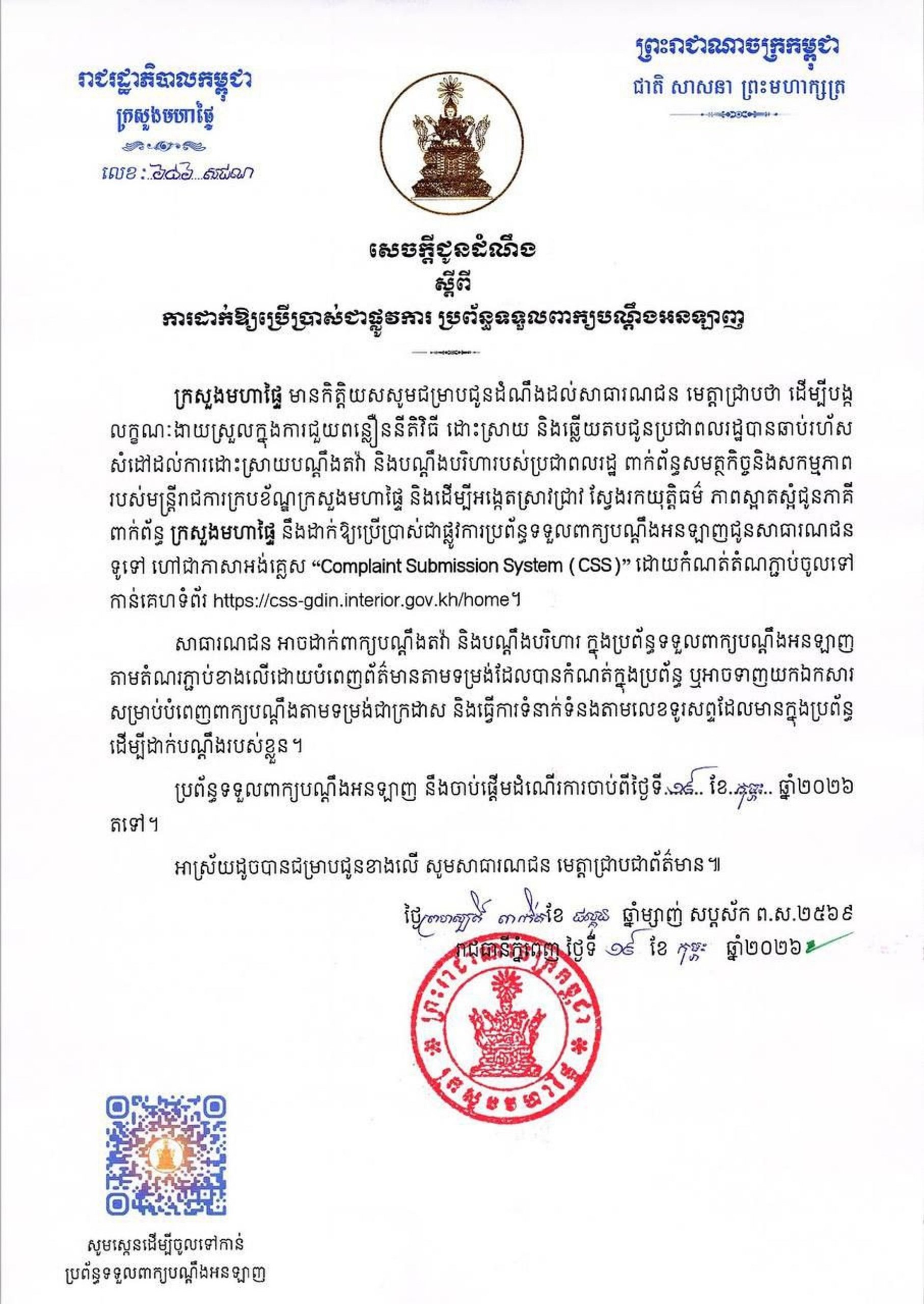 ក្រសួងមហាផ្ទៃ ជូនដំណឹងពីការដាក់ឱ្យប្រើប្រាស់ជាផ្លូវការ ប្រព័ន្ធទទួលពាក្យបណ្តឹងអនឡាញ. ព័ត៌មានជាតិ ដោយ អាស៊ាន ដេលី ថ្ងៃទី 19 ខែ ខែកុម្ភៈ ឆ្នាំ 2026 7 ផ្សាយ:ថ្ងៃទី១៩ ខែកុម្ភៈ ឆ្នាំ២០២៦ ដោយ:សៅ វាសនា(HarryVS) 7 ចែករំលែក