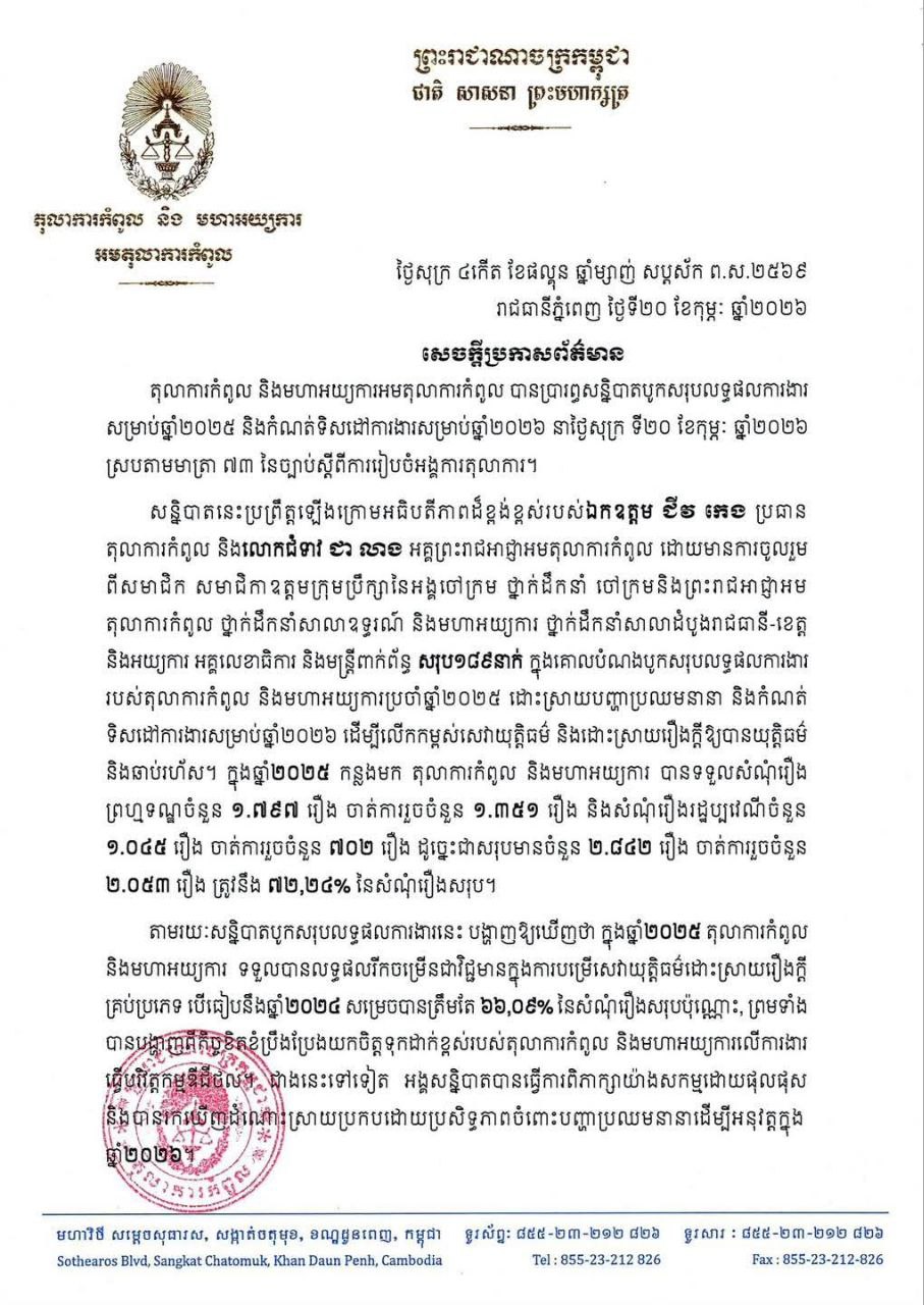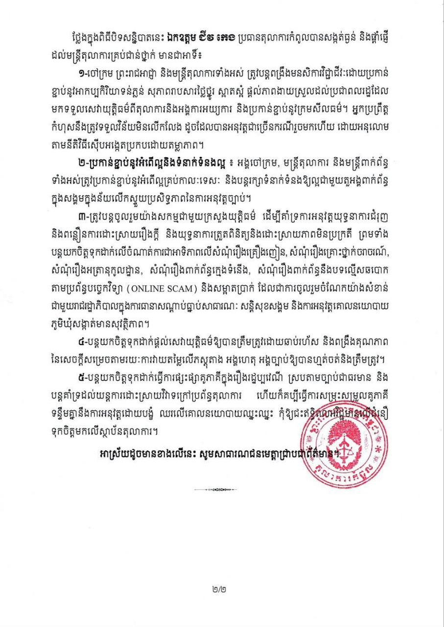 សន្និបាតតុលាការកំពូល៖ ចៅក្រម ព្រះរាជអាជ្ញា និងមន្ត្រីតុលាការទាំងអស់ត្រូវបន្តពង្រឹង មនសិការវិជ្ជាជីវៈដោយប្រកាន់ខ្ជាប់នូវអាកប្បកិរិយាទន់ភ្លន់ សុភាពរាបសារថ្លៃថ្នូរ ស្អាតស្អំ ផ្តល់ភាពងាយស្រួលដល់ប្រជាពលរដ្ឋដែលមកទទួលសេវាយុត្តិធម៌ពីតុលាការ និងអង្គការអយ្យការប្រកាន់ខ្ជាប់នូវក្រមសីលធម៌ អ្នកប្រព្រឹត្តកំហុសនឹងត្រូវទទួលវិន័យមិនលើកលែងដូចដែលបានអនុវត្តជាច្រើនករណីរួចមកហើយ ដោយអនុលោមតាមនីតិវិធី ស៊ើបអង្កេតប្រកបដោយតម្លាភាព។