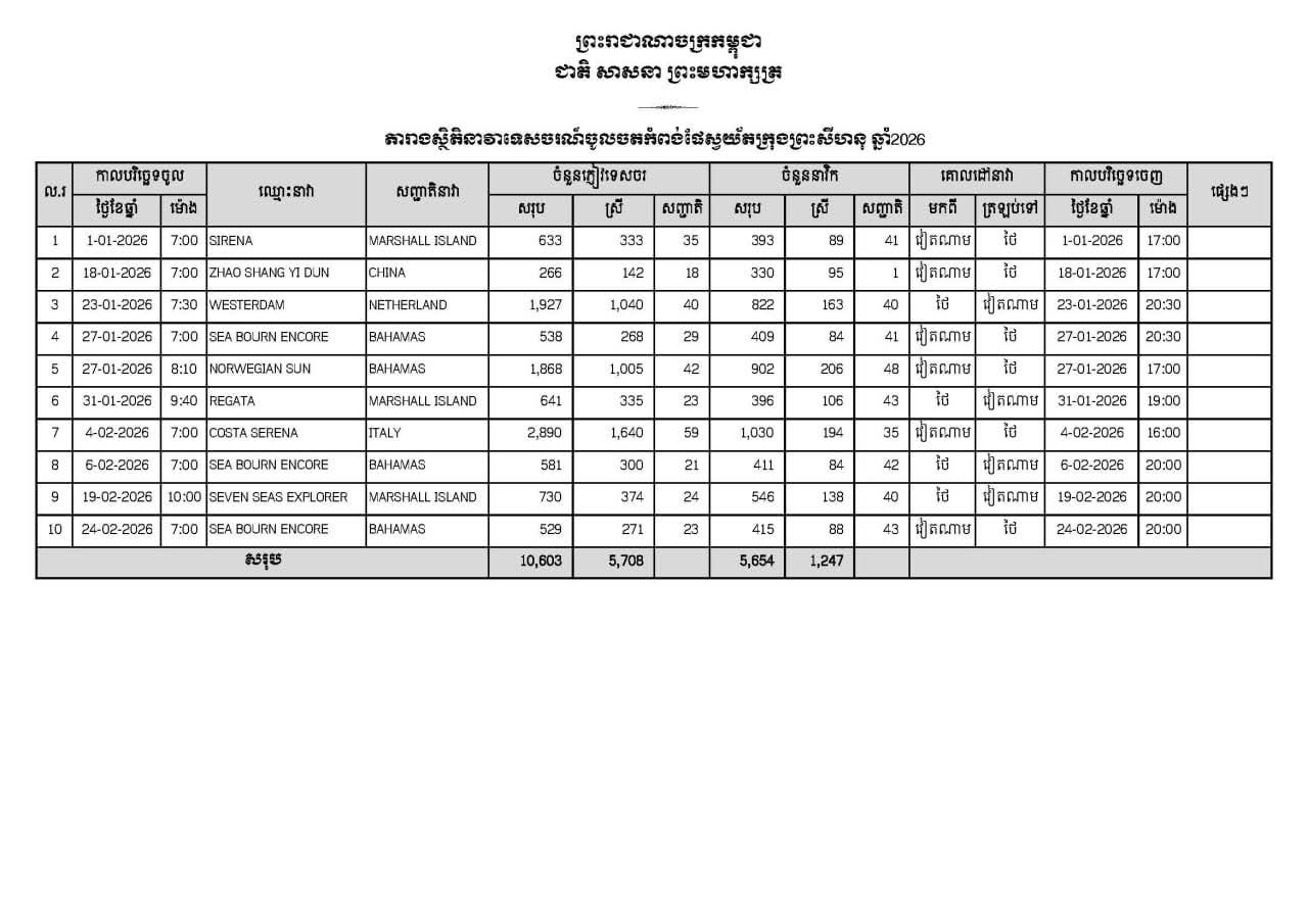 (ខេត្ត​ព្រះសីហនុ)​: នៅវេលាម៉ោង 07:00 នាទី ថ្ងៃទី24 ខែកុម្ភ: ឆ្នាំ2026 នាវាទេសចរណ៍ចំនួន 1គ្រឿង ឈ្មោះ SEABOURN ENCORE សញ្ជាតិ BAHAMAS បានចូលចតនៅកំពង់ផែស្វយ័តក្រុងព្រះសីហនុ​ ដោយ​សុវត្ថិភាព​។