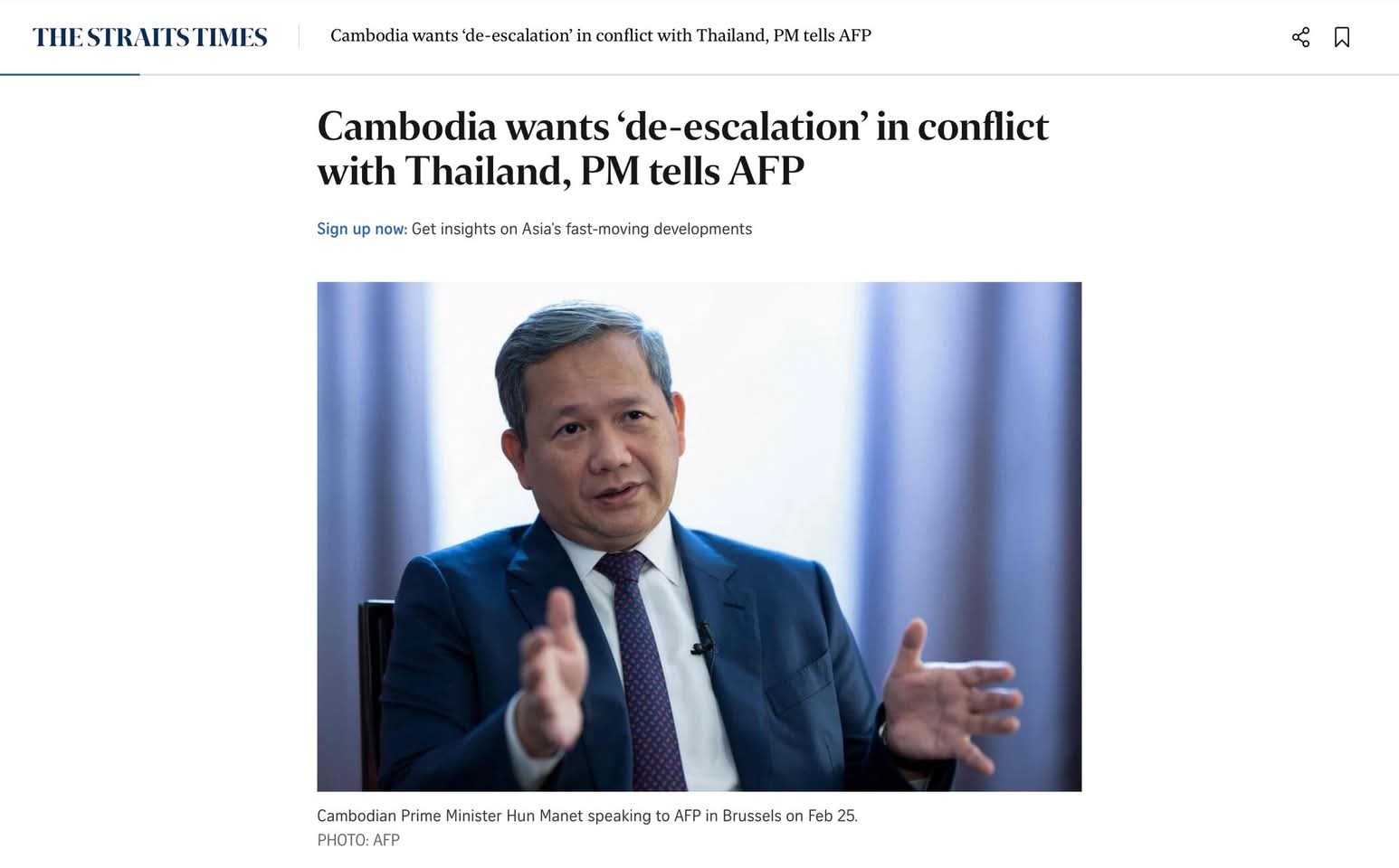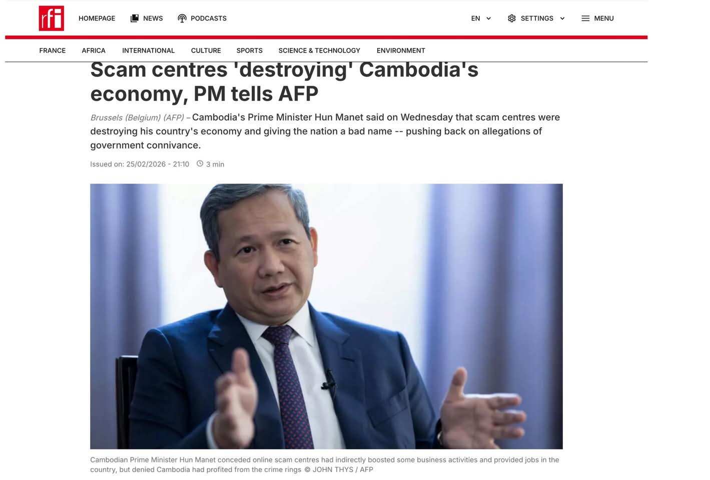 នៅថ្ងៃទី២៥ ខែកុម្ភៈ ជាថ្ងៃចុងបញ្ចប់នៃដំណើរទស្សនកិច្ចនៅទ្វីបអឺរ៉ុប សម្តេចធិបតី ហ៊ុន ម៉ាណែត នាយករដ្ឋមន្ត្រីបានផ្តល់បទសម្ភាសពិសេសផ្តាច់មុខដល់ទីភ្នាក់ងារសារព័ត៌មានបារាំង AFP នៅប្រទេសបែលហ្សិកដោយលើកឡើងពីស្ថានភាពព្រំដែនកម្ពុជាថៃ និងការប្រយុទ្ធប្រឆាំងនឹងការឆបោកតាមបច្ចេកវិទ្យា Scam Online។